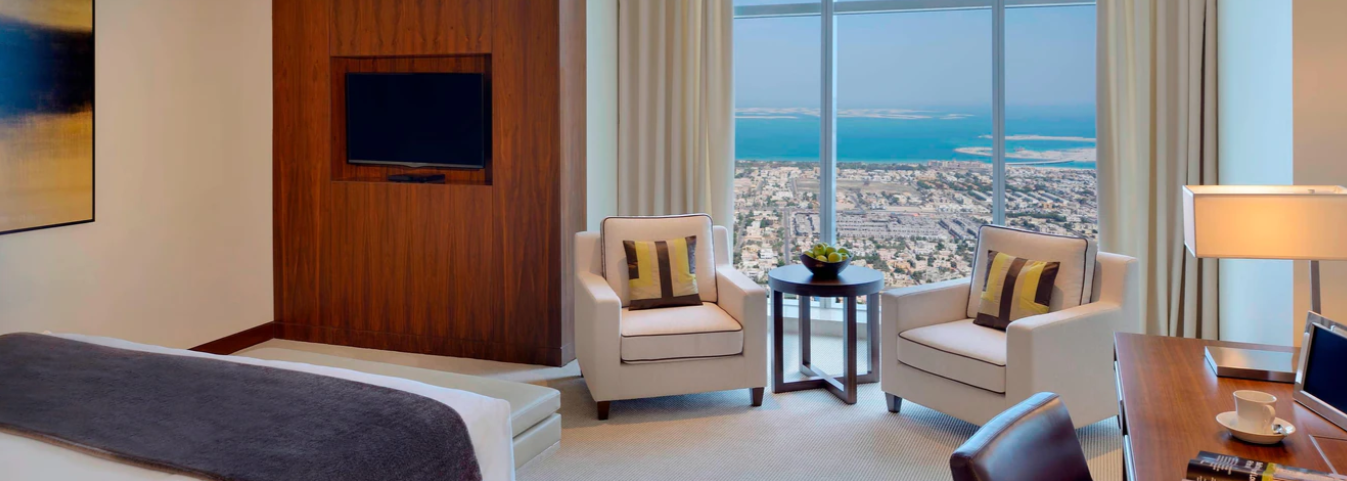 Écrins de luxe et belvédères privilégiés pour admirer une vue unique sur Dubaï, les chambres Deluxe offrent leurs généreux espaces aux couples en quête d’intimité.