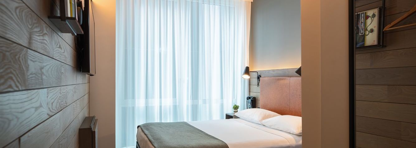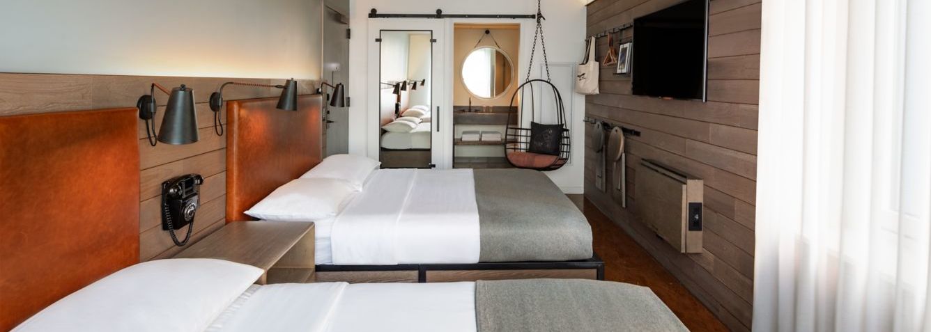 Les chambres du Moxy NYC Downtown ont été aménagées de manière à offrir aux couples et aux familles en séjour dans la métropole un cadre cosy. Elles se distinguent par l'omniprésence du bois, leur tête de lit façon cuir et leur fauteuil suspendu.
