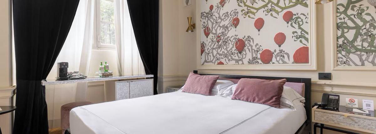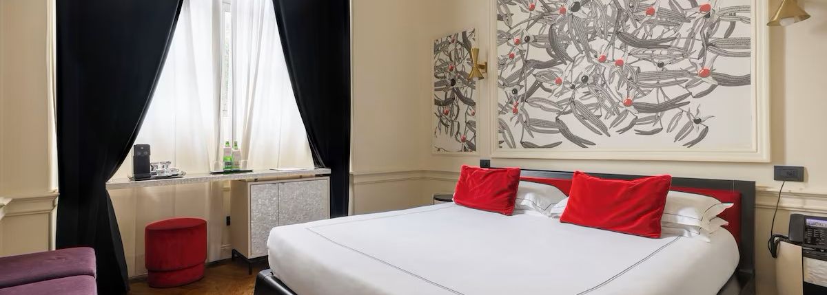 À deux pas de la Villa Aldobrandini, le Roma Luxus Hotel ouvre ses portes au cœur du Rione Monti. Pour faire rimer votre séjour dans le cœur battant de Rome avec repos et gourmandise, votre hôtel 5* met à votre disposition ses chambres luxueuses au décor créatif et son bistrot convivial. Un espace bien-être avec sauna et bain à remous ajoute aux attraits de cette adresse de charme conjuguant tradition ancienne et design moderne. À proximité de l'hôtel, la ligne B du métro (stations Cavour et Colisée) vous permet de visiter la Cité Éternelle en toute autonomie.