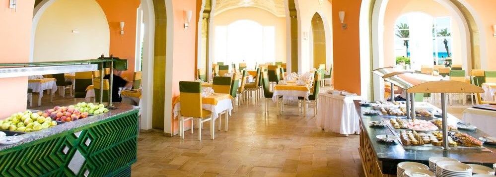 Dans une salle au plafond haut et ouvragé, vous découvrez un buffet copieux et varié composé de spécialités tunisiennes et internationales. Le restaurant qui organise régulièrement des soirées à thème vous offre une vue sur le jardin.