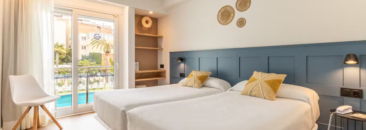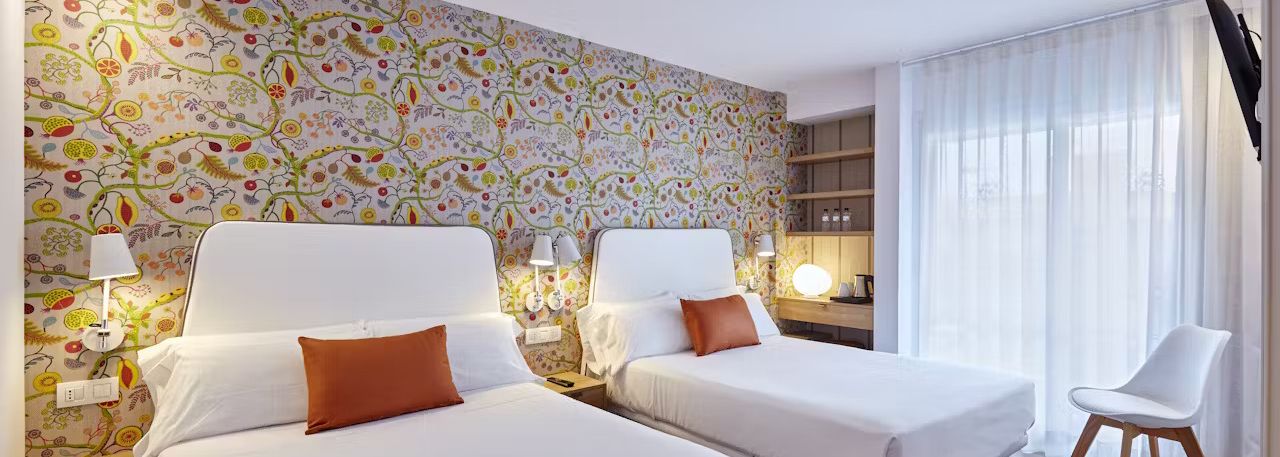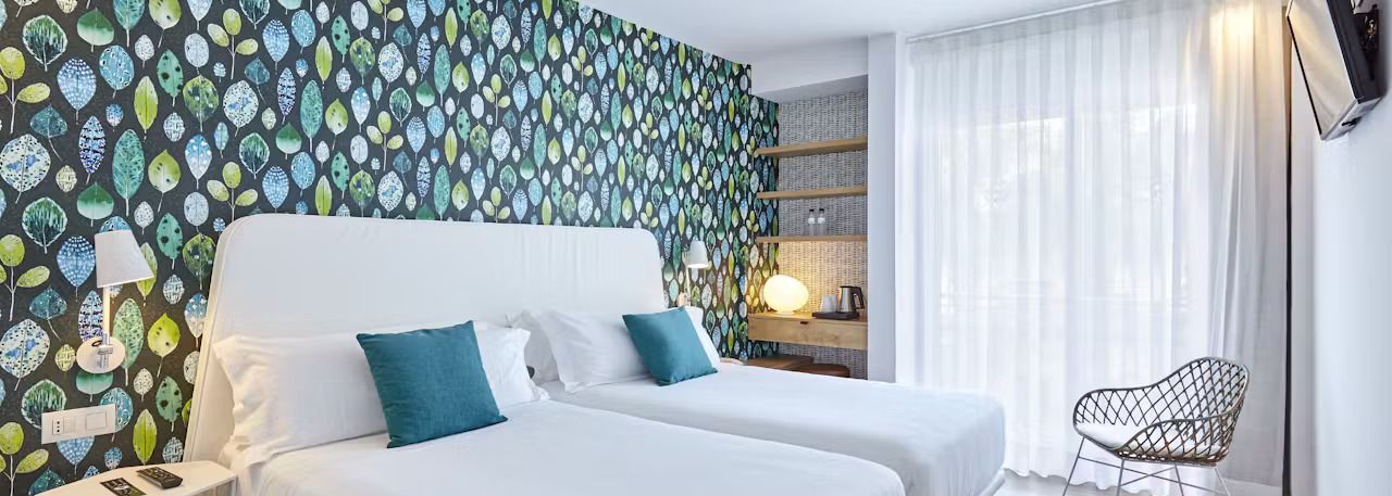 De belles chambres à la décoration contemporaine composent l'Hotel Anabel. Dans chacun de ces hébergements, un mur habillé de papier peint accroche le regard et donne du caractère à la pièce.