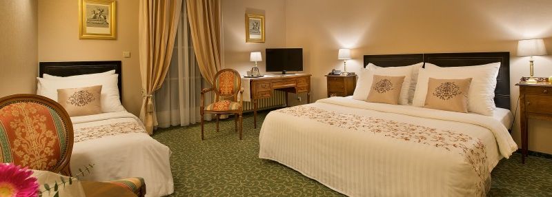 En couple, vous séjournez dans une chambre au décor classique et soigné, avec minibar, écran plat, bouilloire, coffre-fort et téléphone. La salle de bains est équipée d’une douche ou d’une baignoire.