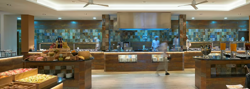 Ce grand restaurant déploie ses buffets pour le petit déjeuner, le déjeuner et le dîner. Des recettes internationales titillent les papilles. Pour déguster votre sélection, vous pouvez vous installer dans la salle joliment décorée ou sur la terrasse donnant sur la mer.