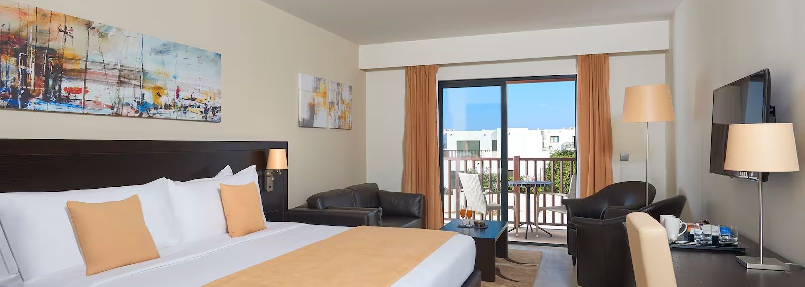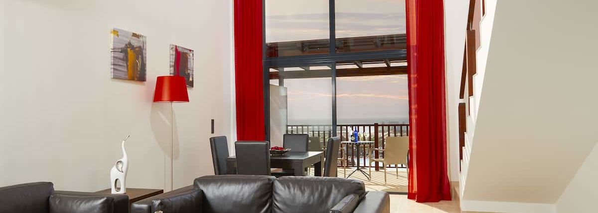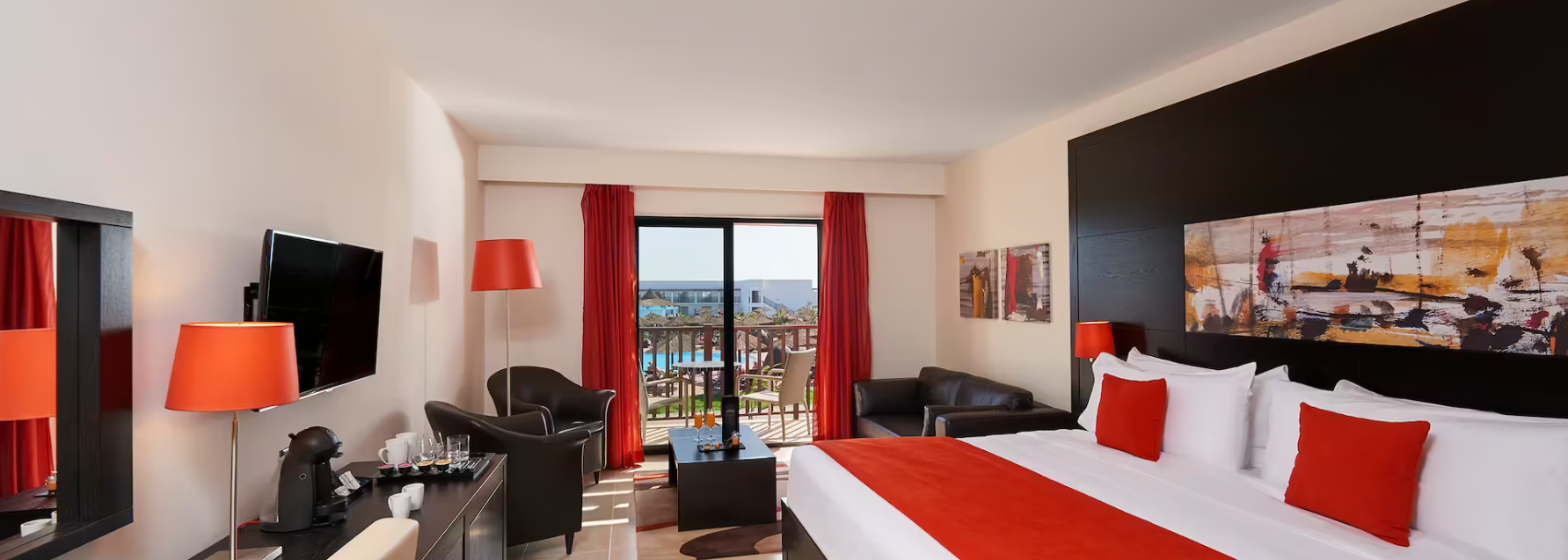 De grandes chambres aux murs clairs vous accueillent pendant votre séjour sur l'île de Sal. Ces vastes espaces aux belles prestations possèdent un élégant mobilier en bois sombre associé à des touches de rouge.