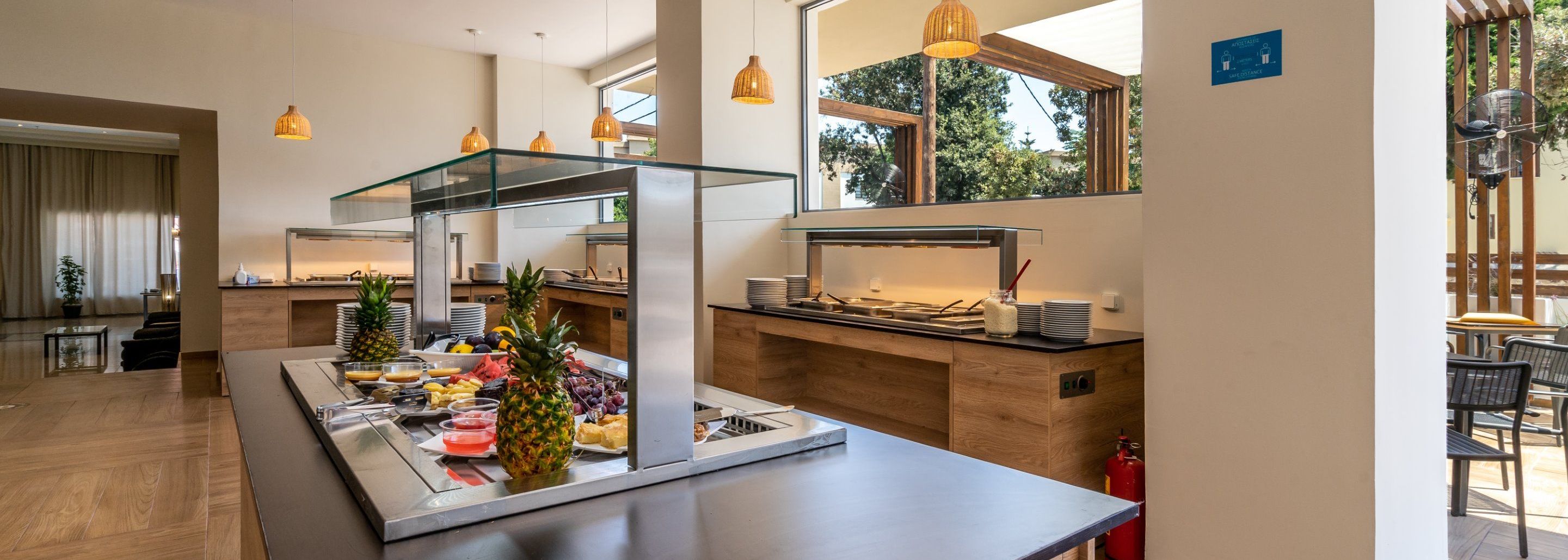 Le restaurant de l'hôtel dresse un généreux buffet pour le petit déjeuner, composé de spécialités grecques, de charcuterie ou encore de fromage. Le midi et le soir, il propose des menus fixes, permettant aux hôtes de découvrir les saveurs de la cuisine méditerranéenne. Vous vous attablerez en terrasse.
