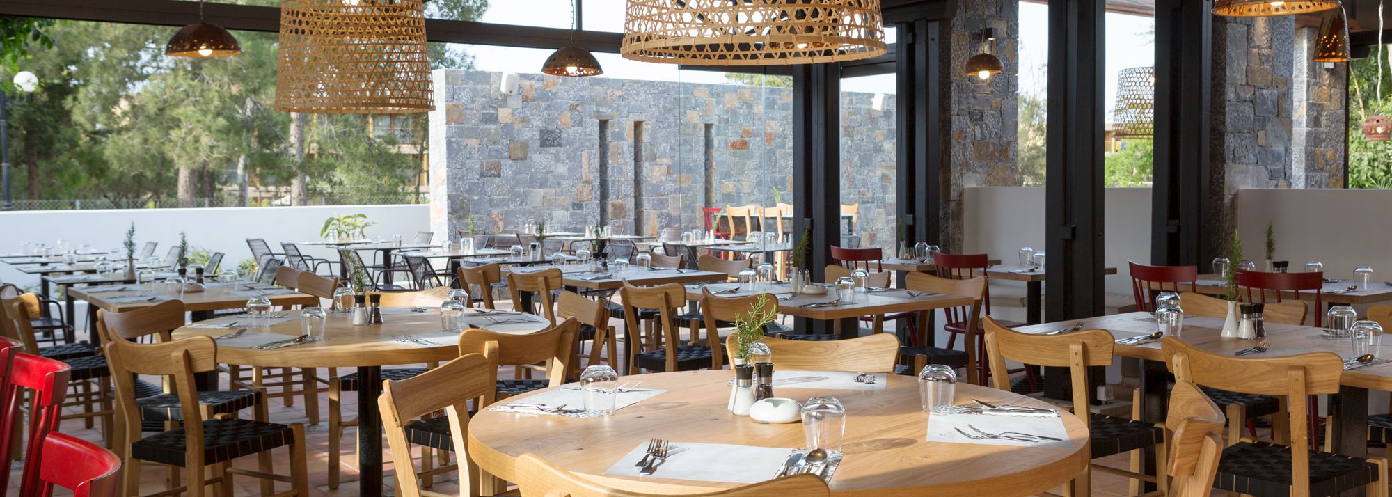 La salle de restauration ouvre ses portes pour le petit déjeuner et le dîner. Elle met à disposition des buffets garnis de mets inspirés des gastronomies crétoises et méditerranéennes, ainsi que de spécialités aux accents du monde entier.