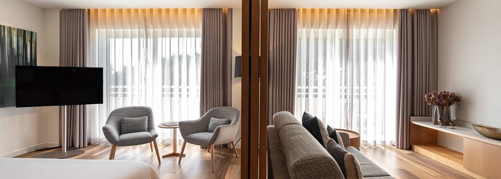Ancré au cœur du verdoyant parc naturel de Cascais-Sintra, face à un parcours de golf de 18 trous, l’hôtel Quinta da Marinha Resort 5* est un havre paisible, où l’on apprécie pleinement les délices du farniente. La couleur ocre du bâtiment contraste harmonieusement avec l’environnement et participe au charme des lieux. Au loin, l’immensité bleue de l’océan Atlantique complète ce tableau idyllique. La modernité de l’architecture se reflète dans la décoration intérieure, jusqu’au lobby orné de six peintures de l’artiste portugaise Ana Safer, qui racontent l’histoire des vins lusitaniens.