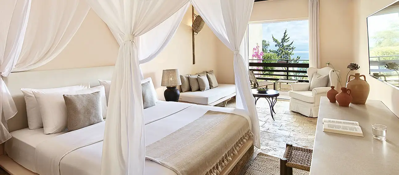 La Chambre Supérieure Vue Jardin – Balcon Privé (28 m² intérieur) aménagée avec élégance et décorée dans un style ionien offrant un sentiment d’espace et de grandeur, ces chambres donnent sur les jardins. Pour avoir une magnifique vue sur la mer il faudra privilégier la version Chambre Supérieure Vue Mer – Balcon Privé. Si vous souhaitez bénéficier d’une vue panoramique sur la mer Ionienne depuis le dernier étage du resort, nous vous conseillons alors de réserver la Chambre Lux Me Sky Vue Mer & – Balcon Privé.