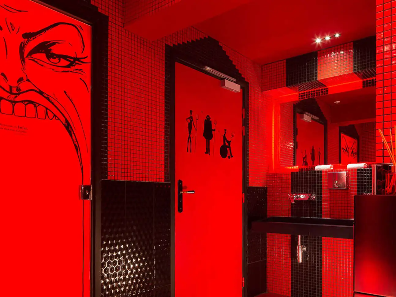 Les chambres, réparties sur sept niveaux, sont chacune dédiées à un péché capital, offrant une expérience unique et intemporelle. Pour une atmosphère encore plus intime et romantique, l'hôtel met à votre disposition un hammam sur le thème de l'enfer.