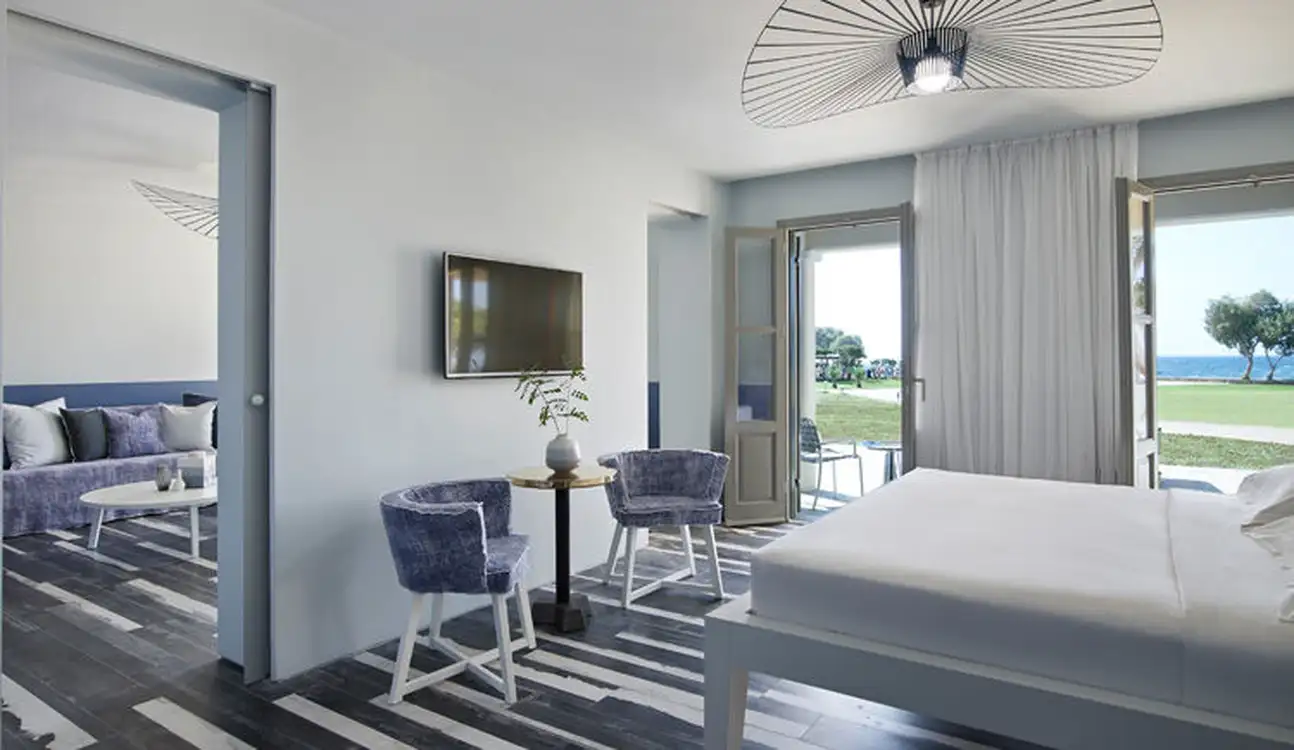 Dans le village des bungalows : La Suites Deluxe Famille Vue jardin (de 43 à 58 m²) est située soit dans le bâtiment principal soit dans un village de bungalows. Elles disposent d’un grand salon et d’une chambre séparée. Le balcon ou la terrasse sont aménagés avec vue sur les jardins. La Suites Deluxe Famille Vue Mer est superbe. Ces Suites (42 à 62m²), se composent d’une chambre et d’un salon (canapé convertible). La salle de bains dispose d’une baignoire, d’une douche et de toilettes séparés. La terrasse offre un espace privilégié et aménagé, avec transats et parasol, depuis lequel profiter d’une belle vue sur les eaux de la Méditerranée. La Suites Luxe 1 Chambre Vue Mer. Ces grandes suites (65 à 75m²) à la décoration moderne et épurée sont habillées avec des associations de nuances de bleu et de gris. Les chambres disposent d’un accès direct à la salle de bains. Spacieuse et très originale, notamment dans la forme de la baignoire ; douche et toilettes sont séparés. Peignoirs prévus. Une autre salle de bains donne sur le salon lui aussi très confortable, avec un canapé (convertible) et deux fauteuils. Une grande terrasse est aménagée avec transats et parasol, vue sur la mer. Les Suites Premier Deux Chambres Vue Mer sont les hébergements les plus spacieux disponibles dans le bâtiment principal avec une superficie de 112m². Le design des chambres est superbe, associant tons clairs, du blanc et du mauve. L’appartement dispose de deux chambres et d’un aménagement bien pratique pour les familles (un lit king size et deux lits jumeaux). Chacun sa salle de bains, il y en a deux, avec baignoire, douche et toilettes séparés. Le salon allie élégance et confort, il est équipé d’un canapé et de fauteuils moelleux ainsi que de deux portes fenêtres ouvertes sur la terrasse aménagée (transats et parasol). Vue panoramique sur la mer. Un dressing, une salle à manger avec table et chaises pour accueillir 5 personnes complètent l’aménagement de l’espace.