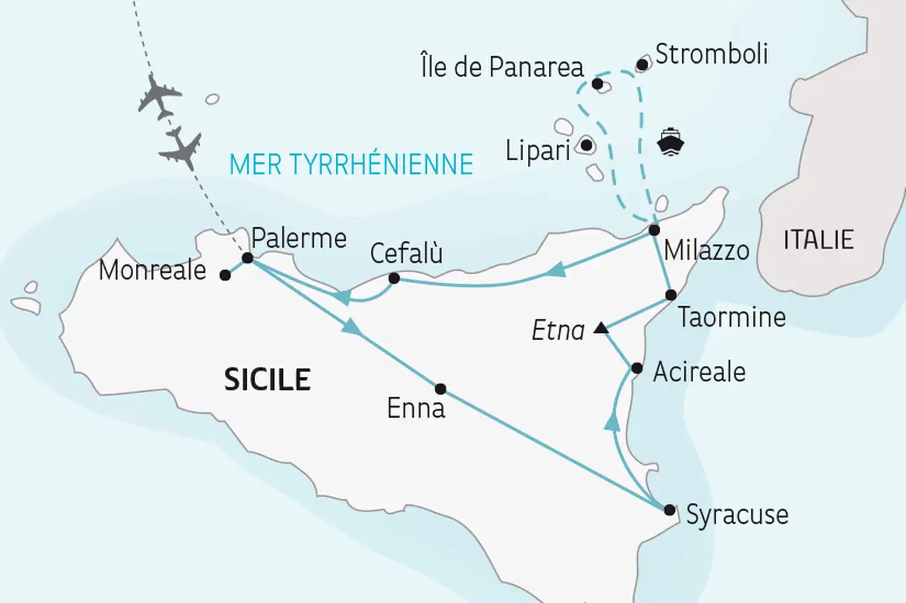 Ce circuit de 8 jours en Sicile vous invite à venir y découvrir toutes ses richesses : Palerme, la capitale façonnée par de nombreux styles architecturaux, Cefalù, accueillante petite ville d'artisans et de pêcheurs, le mont Etna, volcan actif le plus haut d'Europe, ou encore Taormine, station touristique de renommée internationale. Vous embarquerez également en direction des îles Éoliennes, archipel volcanique situé dans la mer Tyrrhénienne au nord de la Sicile, avec la découverte de Lipari, Panarea, Stomboli et Vulcano. Un voyage inoubliable au c?ur de la Méditerranée !