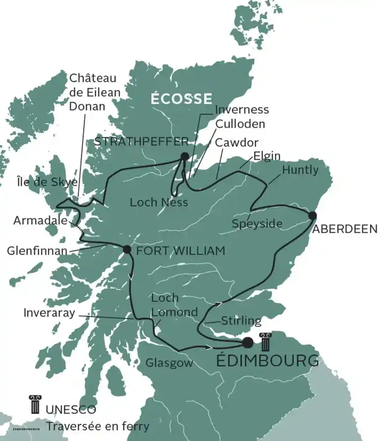 Départ pour la mythique et très cinégénique île de Skye dont vous traverserez la partie méridionale, au cœur de paysages souvent considérés comme les plus beaux de Grande-Bretagne ! À vous lochs et landes romantiques rehaussés par une dentelle de côtes délicatement découpées. En route, arrêt-photo au célèbre château d’Eilean Donan, niché au cœur d’un paysage somptueux, qui a servi de décor à de nombreux films dont Highlander. Déjeuner en cours de route. Traversée en ferry à Armadale et poursuite vers la région de Fort William en empruntant la route longeant le viaduc de Glenfinnan. Dîner et nuit à l’hôtel.