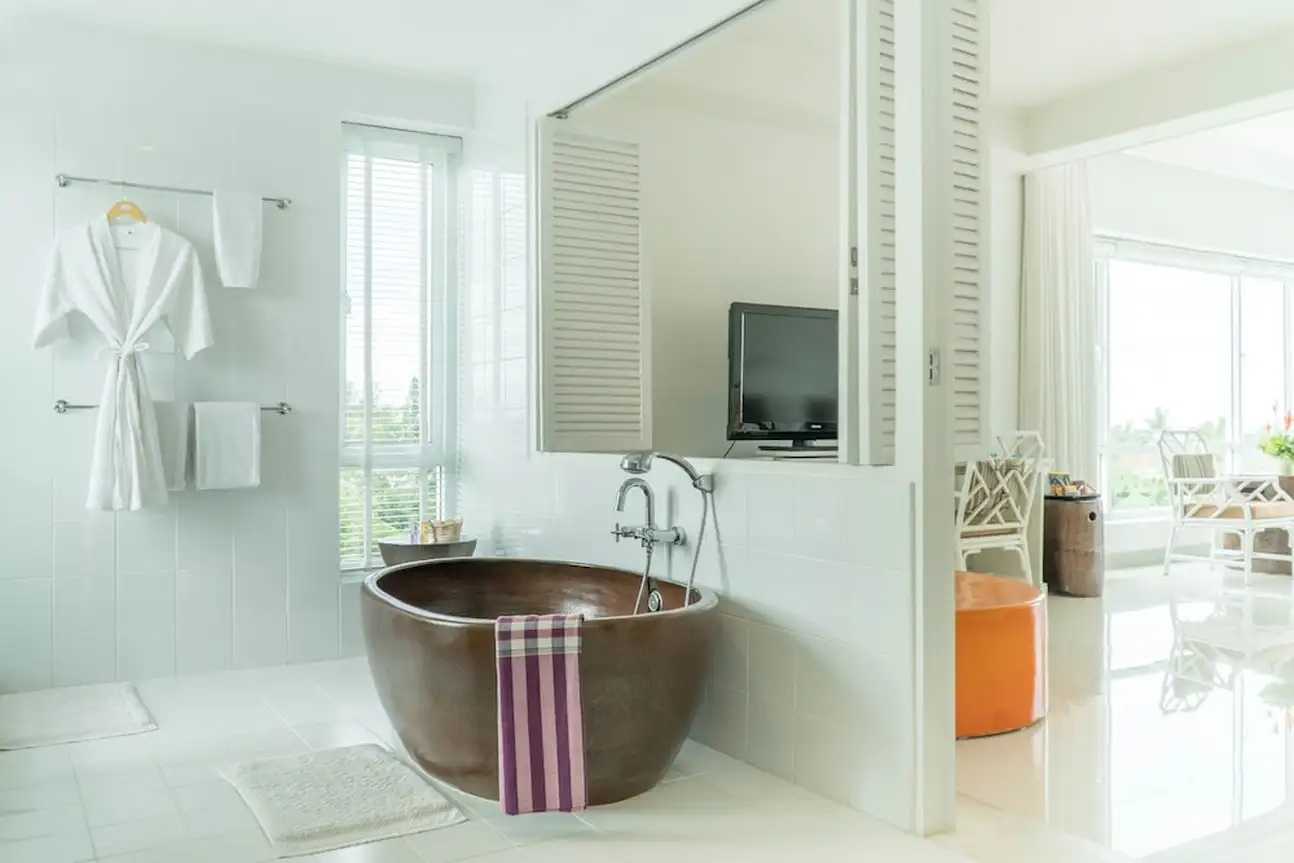 Vous connaissez les soins signature dans les spas, les plats signature dans les restaurants, mais sans doute pas les baignoires signature dans les hôtels ! Et pourtant, le Cera Resort Cha Am en a fait sa marque de fabrique, son élément distinctif. « Cera », c’est le diminutif de « céramique », un matériau omniprésent dans ce charmant hôtel au bord du golfe de Thaïlande. Concrètement ? On le découvre en particulier dans les salles de bains avec donc, de très originales baignoires colorées, griffées Tao Hong Tai, la plus ancienne usine de céramique de Thaïlande. Une référence ! Toutes les chambres sont différentes, mais celles habillées de blanc immaculé, baignées de lumière et parsemées de mobilier en céramique de la même couleur que la baignoire, ont vraiment un truc en plus. C’est frais, léger, on s’y sent bien. Vous retrouverez encore de très belles céramiques et une atmosphère tout aussi apaisante au spa, le temps d’un massage thaïlandais, d’une séance de réflexologie, d’un soin aux huiles aromatiques. Après cela, on ne lâche rien, rendez-vous pour un drink rafraichissant sur votre balcon avec vue mer ou jardin, autour de la piscine en forme de cacahuète, ou sous le vaste pavillon ouvert aux quatre vents sur un pouf… en céramique !