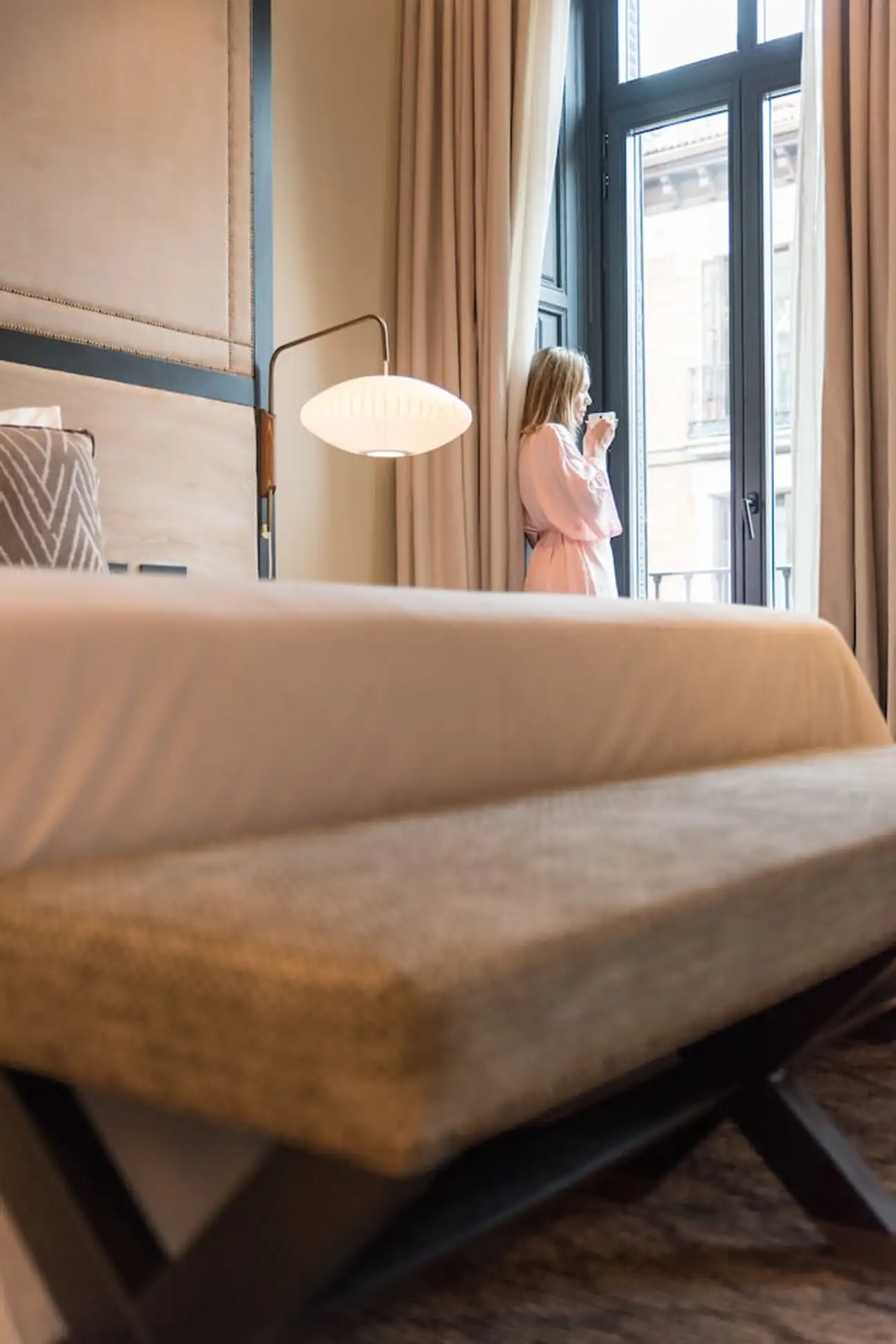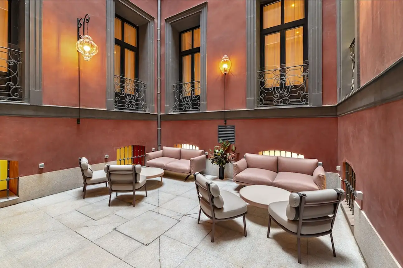 Prêt à voyager dans le temps ? L’hôtel Coolrooms Atocha est un concentré d’époques à lui-seul. Passez le porche baroque de cet ancien palais qui a vu aller et venir bien des carrosses, vous serez sous la protection d'Hermès, dieu des voyageurs… A moins que vous ne préfériez celle du portier, avec son haut de forme, sa queue de pie et sa paire de Richelieu ! Face à la réception, sous un plafond de 7 mètres de hauteur, un escalier monumental, éclairé en rouge, vous fera perdre la tête. Sur chacun des paliers, le chiffre de l’étage apparaît dans une grosse typo ultra moderne, rouge, encore, contrastant avec les moulures néoclassiques du bâtiment original. Reprenez votre souffle, à moins d’avoir triché en prenant l’ascenseur ! Poussez la porte de votre chambre, immense ! Ici aussi, le classicisme des pièces se laisse volontiers twister par la couleur et l’audace. Dans votre salle de bain, une baignoire design, posée à même le sol, nargue une robinetterie rétro. Et pour arrêter le temps, le Coolrooms Atocha vous invite au bord de la piscine, dans un charmant patio arboré. Ecoutez le glouglou de la fontaine et profitez-en pour commander un verre ! Déconnexion totale... #BeCool, c’est un peu l’idée ici non ?