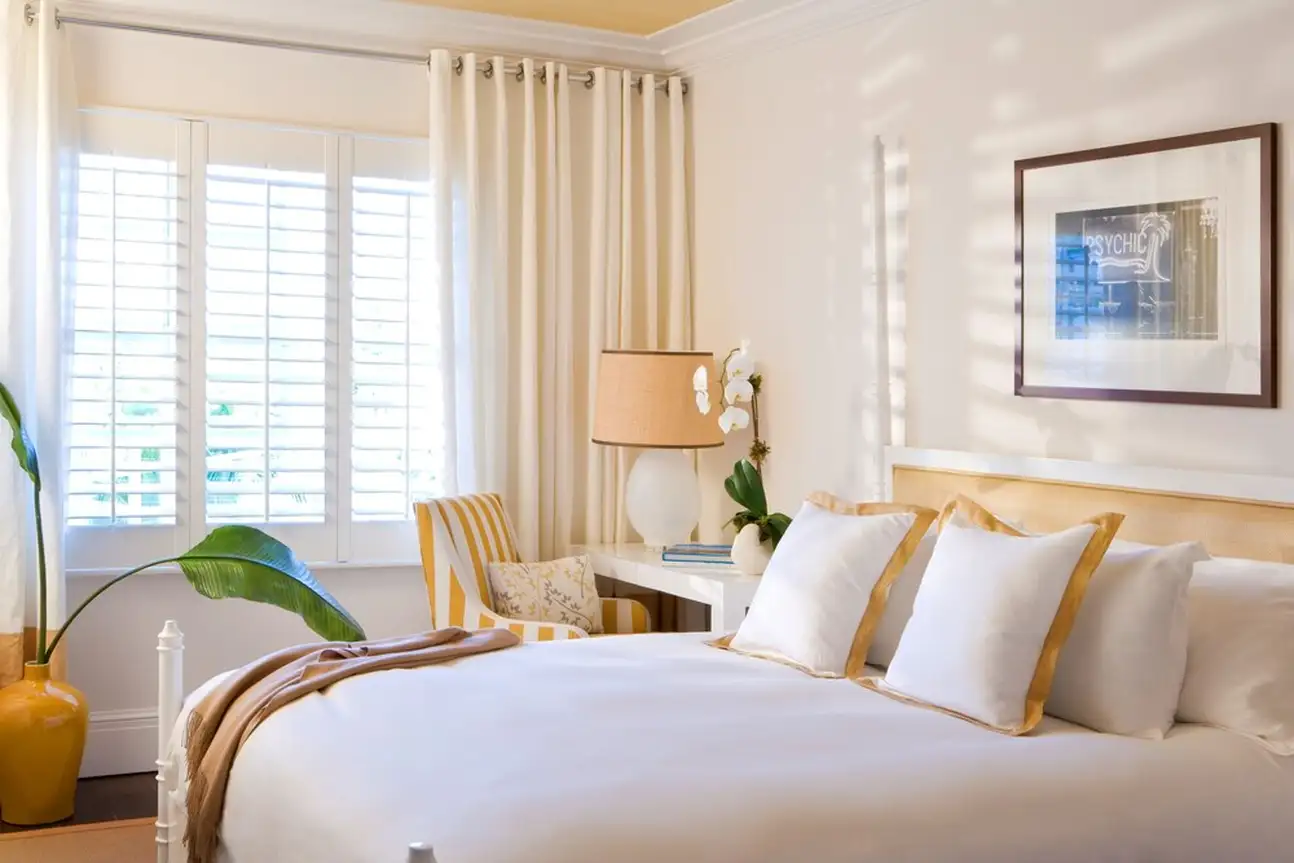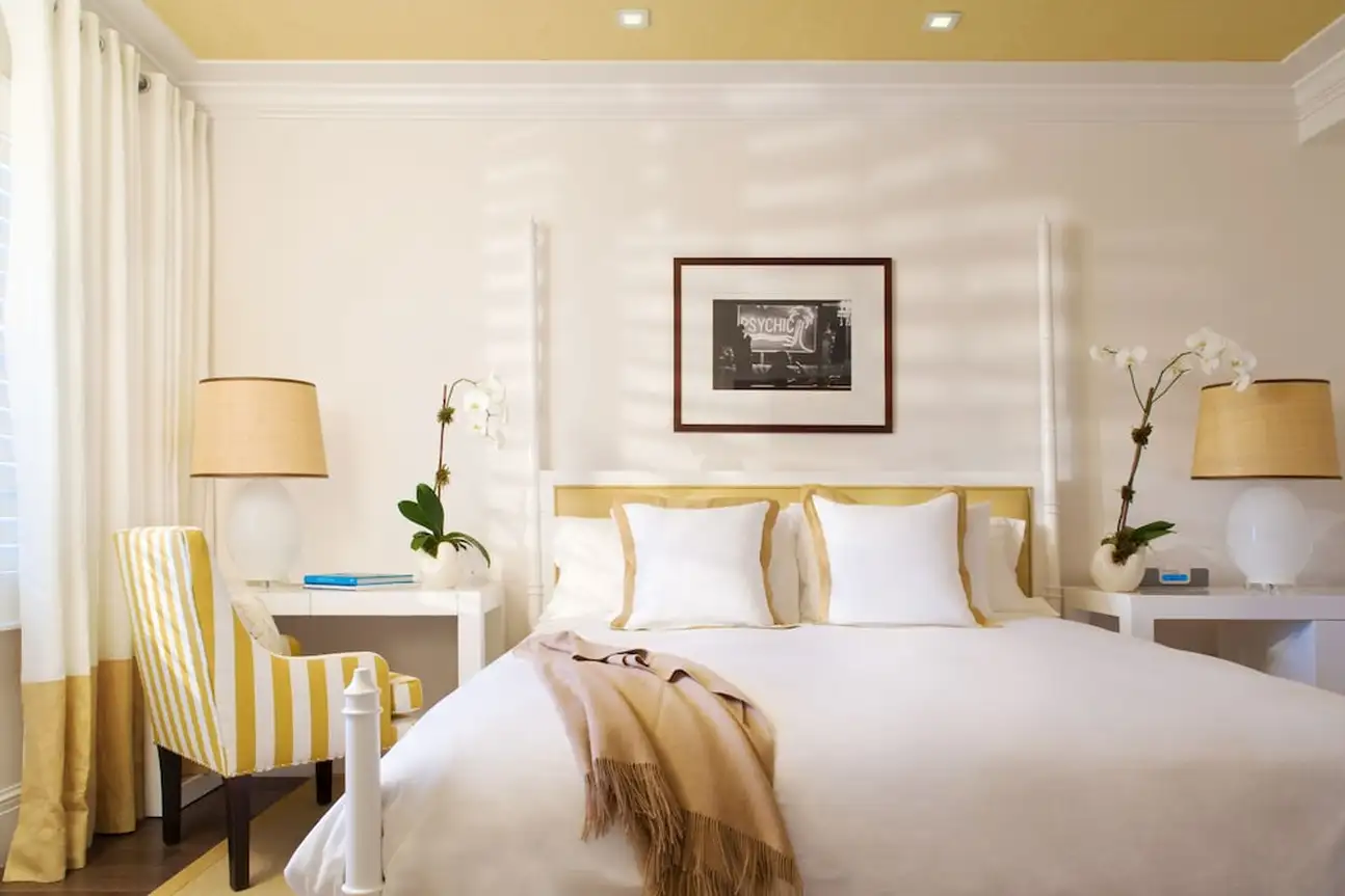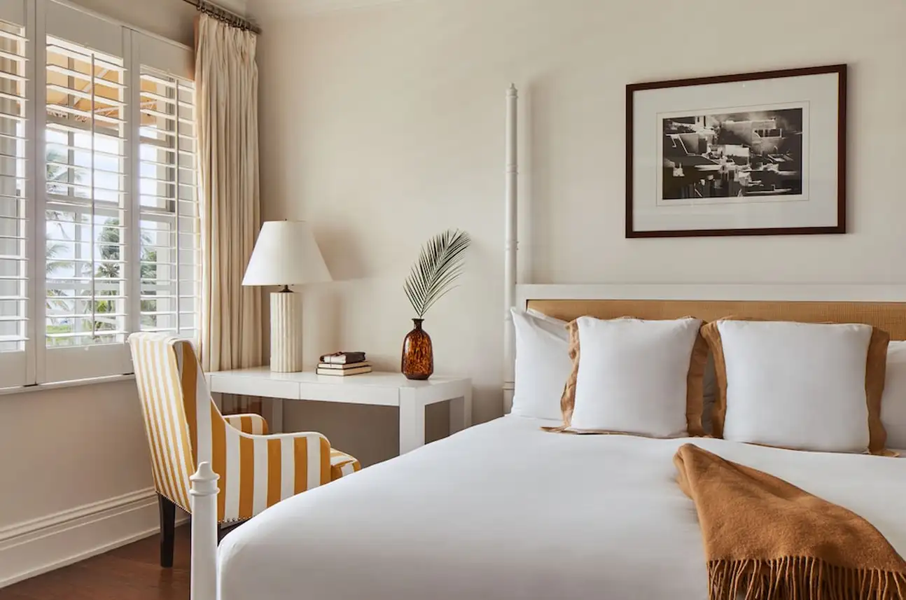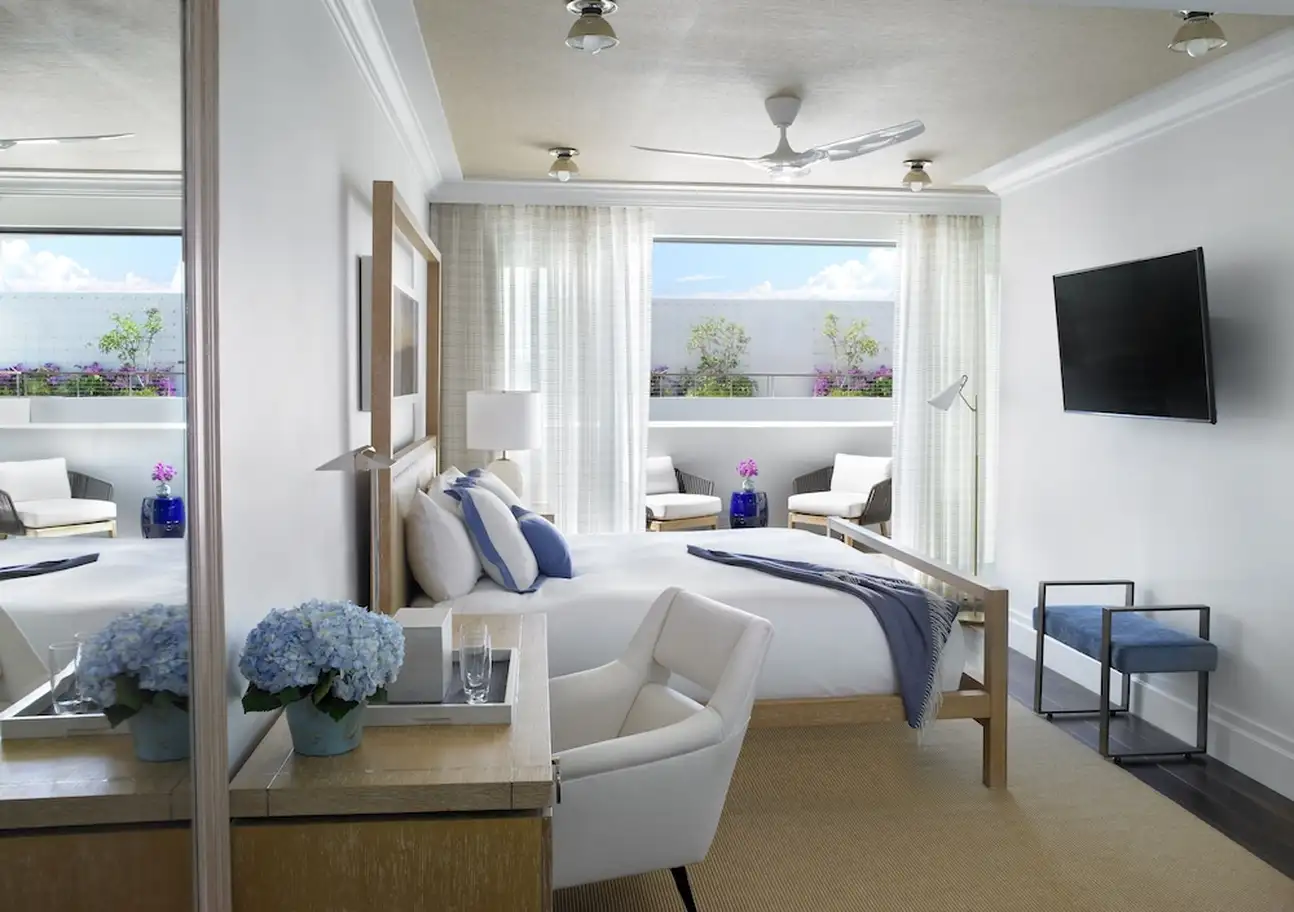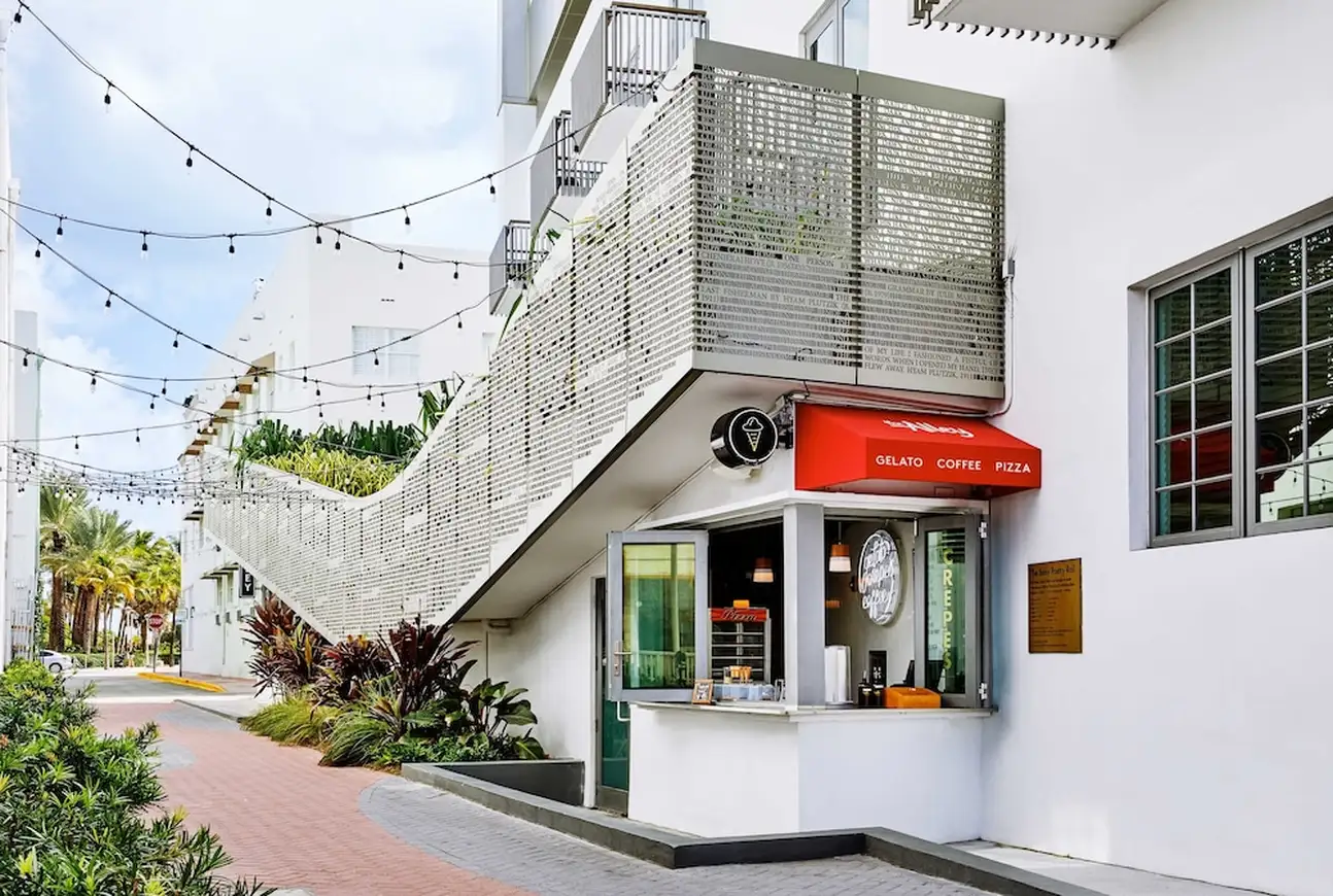La culture est essentielle, qu’on le veuille ou non. A The Betsy South Beach, il n’y a pas de débat là-dessus et l’hôtel place vraiment les arts au centre. Au fil de vos journées, vous apprécierez donc des portraits en noir et blanc dans les couloirs, des tableaux dans les chambres et surtout deux pièces d’art contemporain grandiloquentes à l’extérieur. La première est la Betsy Orb, sorte de boule blanche géante coincée entre deux bâtiments, la deuxième est le Poetry Rail, barrière en métal avec des bouts de poésie de grands auteurs. L’établissement accueille justement des écrivains en résidence, avec qui vous pourrez discuter lors des talks organisés avec eux. Sans oublier des concerts chaque soir dans le lobby ! Mais tout ça n’empêche pas à l’hôtel d’être super bien décoré. Avec ses volets et sa terrasse sur le trottoir, le bâtiment blanc a des airs de maison sur la plage. Et attention, il cache une piscine et un spa sur le rooftop, une autre piscine dans la cour. Point final : impossible d’être mieux placé, vous êtes tout en haut d’Ocean Drive et la plage est juste en face ! Avec transats et parasols rien que pour vous.