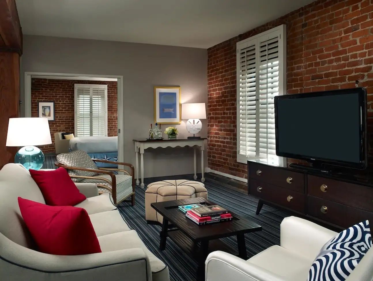 Si ce n’était l’incroyable vue sur le Golden Gate et la baie, vous auriez presque l’impression d’être dans une cabine de bateau. Le confort et l’espace en plus. Le bois peint des têtes de lit s’harmonise parfaitement avec le rouge brique des murs historiques. Une déco aussi chaleureuse que cosy!