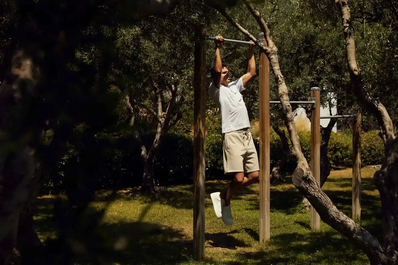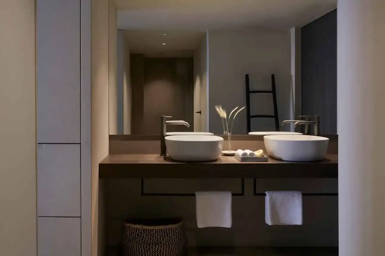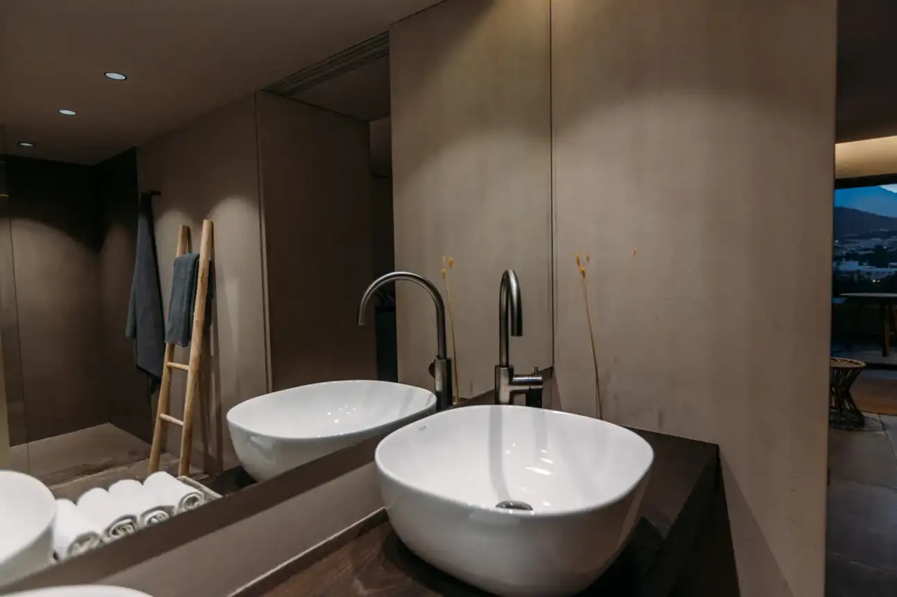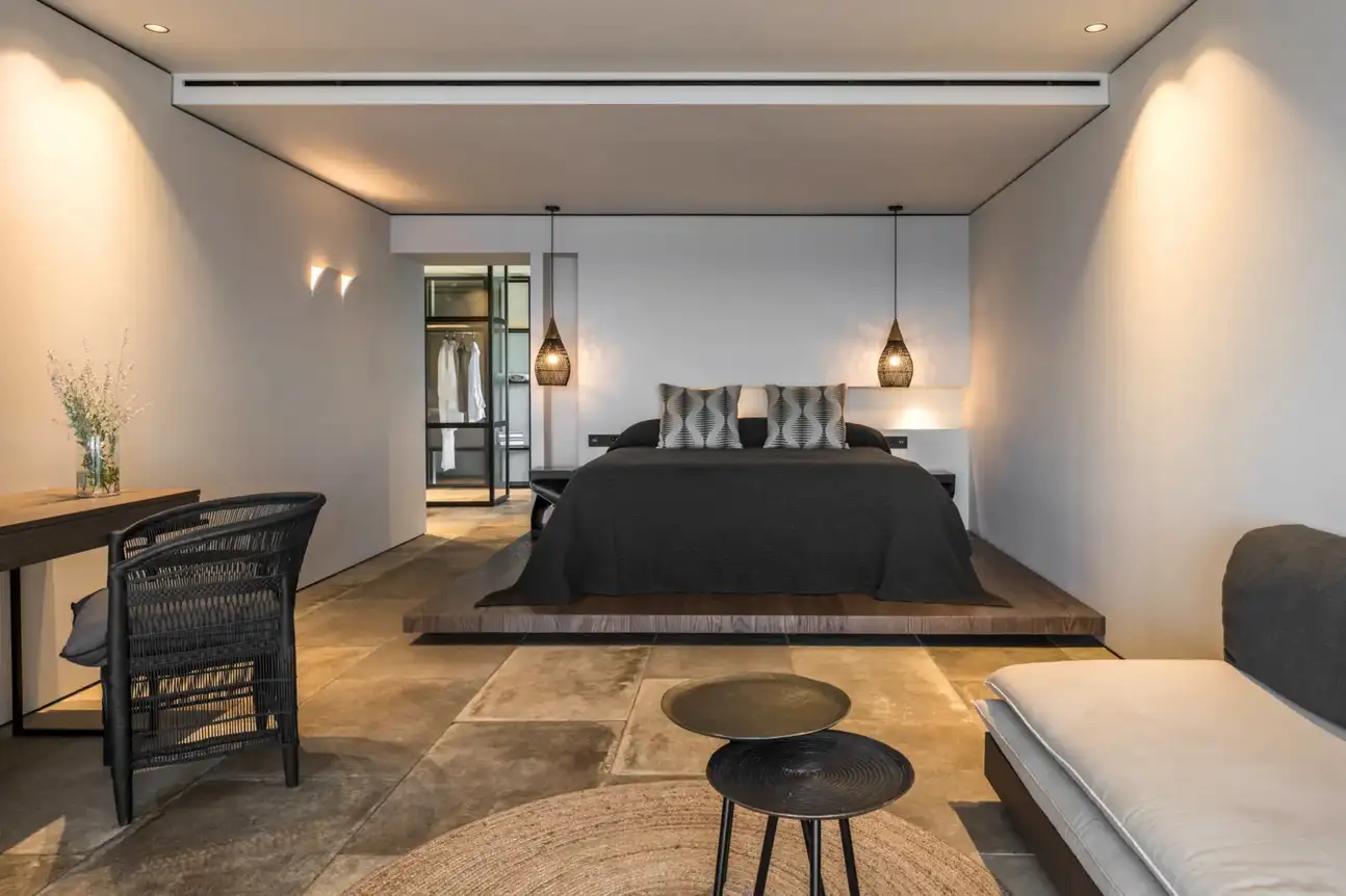 - Suite Infinity Blue : D’une superficie de 45 m², les suites Infinity Blue sont nichées dans des jardins verdoyants, charmantes et élégamment aménagées. Profitez des vues majestueuses à 180 degrés et des senteurs de la mer depuis le salon extérieur baigné de soleil qui donne accès à une piscine partagée avec 3 autres suites. Réveillez-vous dans votre lit king-size et découvrez une sérénité pittoresque, alors que la lumière du matin scintille à la surface de la piscine et de la mer bleue. Chaque suite dispose d'espaces de vie intérieurs, parfaits pour se détendre après des soins de bien-être ou pour explorer l'île. Le placard traversant, le meuble à double vasque et la douche à l'italienne sont lumineux et aérés, tandis que le système KNX® personnalise l'éclairage et la température pour répondre à tous les besoins.