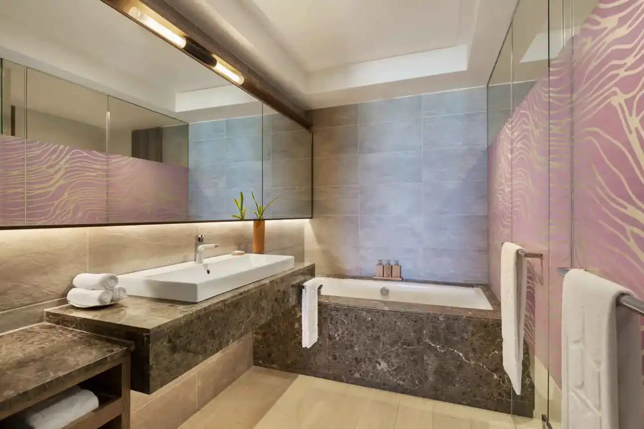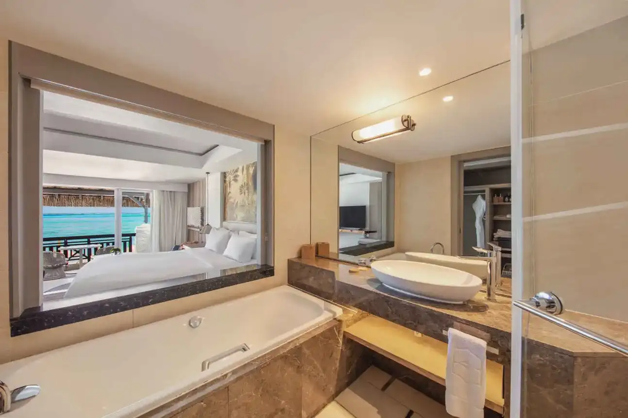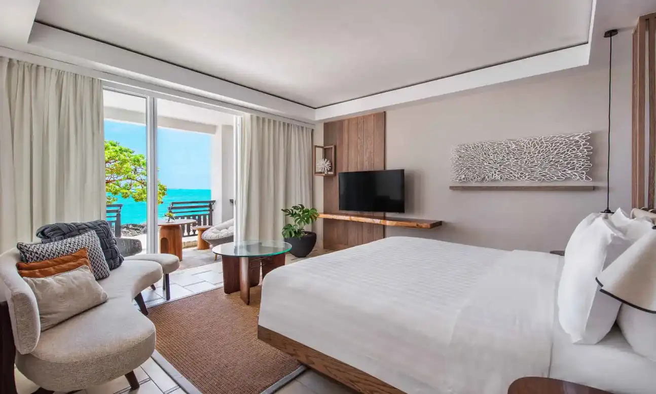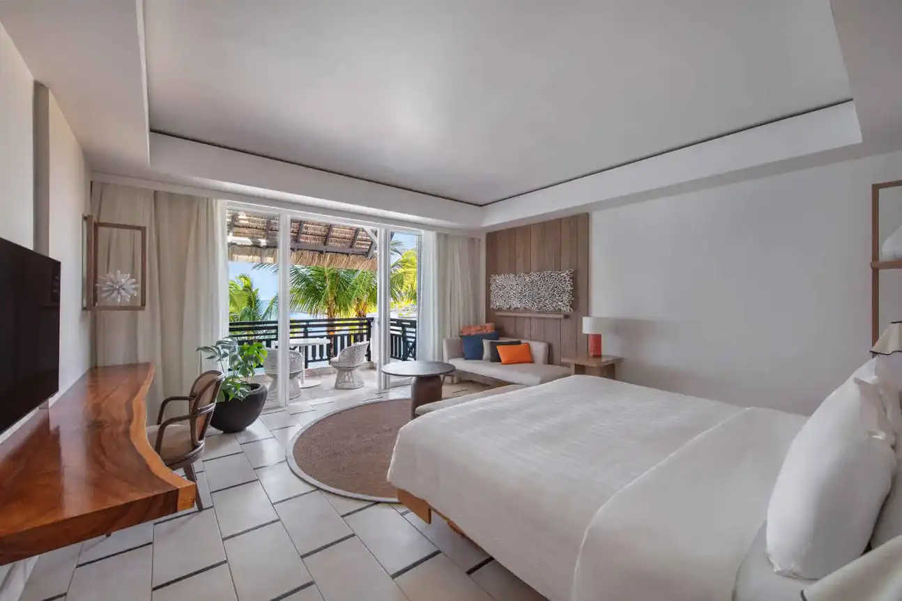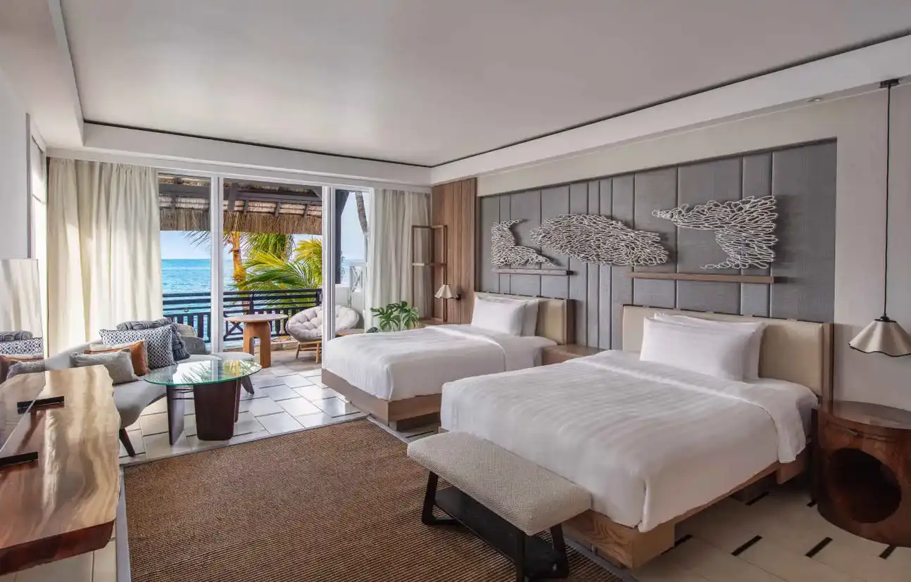Adjacent à un vaste dressing, la salle de bains très spacieuse est ainsi recouverte de marbre avec 2 vasques, douche à l'italienne et baignoire individuelle à fond plat. La chambre dispose d’un lit king-size ou de 2 lits queen-size de grande qualité. Elle est nimbée de couleurs aux tons sable clair et rehaussée de touches d’art mauricien contemporain qui rappelle le monde corallien et la flore locale.