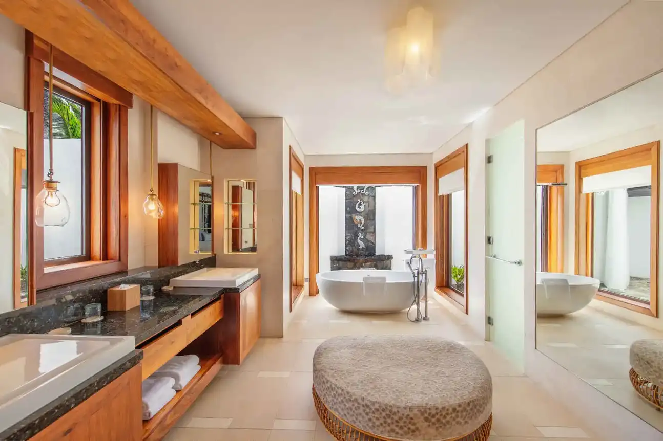 Adjacent à un vaste dressing, les salles de bains très spacieuses sont ainsi recouvertes de marbre avec 2 vasques, douche à l'italienne et baignoire individuelle à fond plat. Les chambres dispose d’un lit king-size et de 2 lits queen-size de grande qualité. Elle sont nimbées de couleurs aux tons sable clair et rehaussée d’éléments décoratifs inspirés de la flore et de la faune mauriciennes.