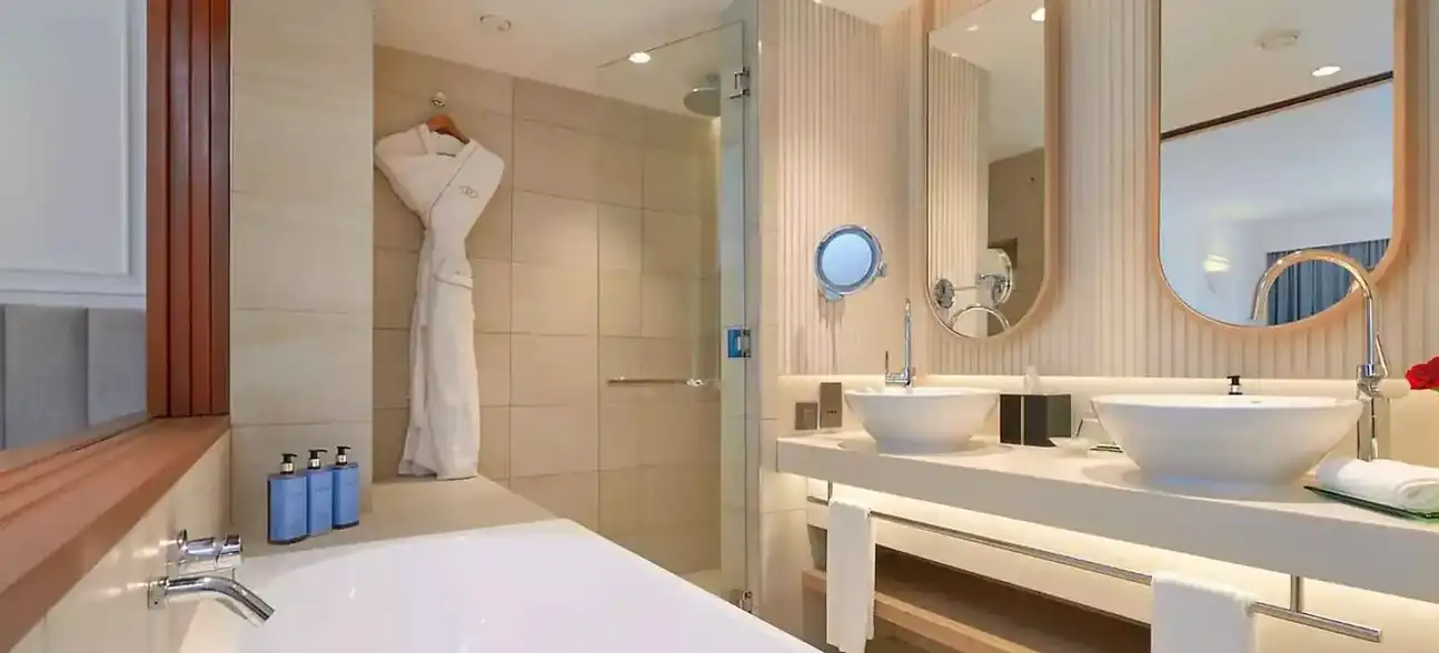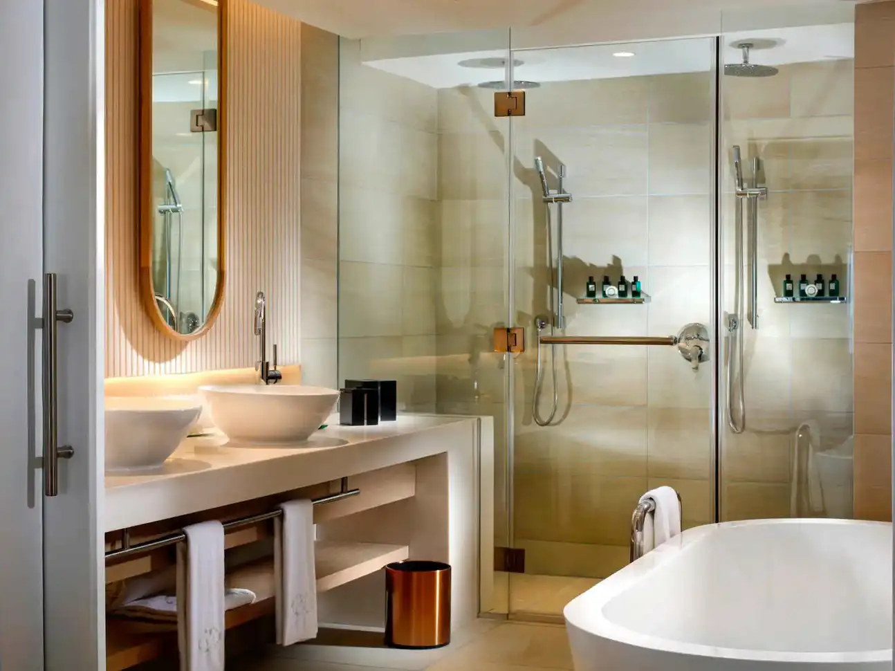 La chambre spacieuse est aménagée avec un lit king-size MyBed™ garantissant un sommeil réparatrice, un bureau fonctionnel et un deuxième téléviseur pour plus de confort. La salle de bains attenante, pensée comme un véritable espace bien-être, dispose d’une douche à effet de pluie, d’une baignoire à remous, d’une double vasque et de miroirs lumineux. Un grand dressing prolonge cet espace.