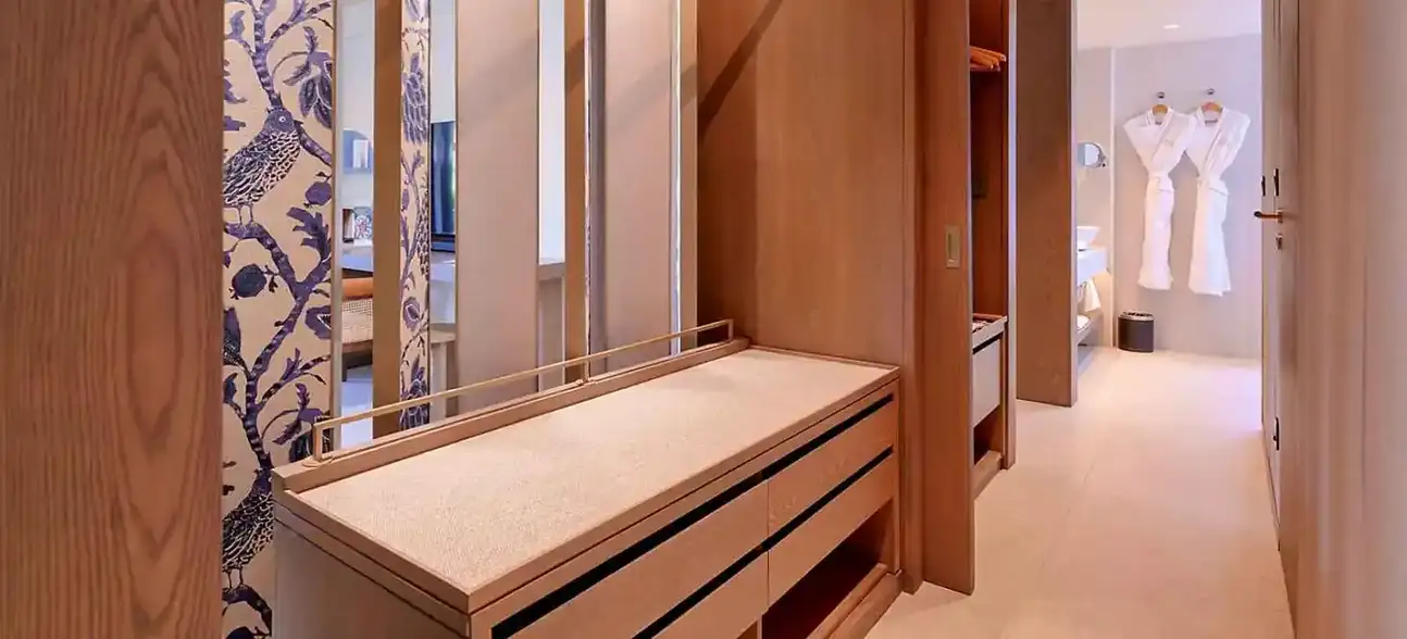 L’espace intérieur se compose d’une chambre et d’un salon séparés par d’élégants panneaux en bois rotatifs, apportant une touche de design créatif. L’espace nuit dispose d’un lit MyBed™ king-size et d’un coin télévision. Le salon est équipé d’un canapé convertible, d’un bureau, d’une télévision et d’un minibar personnalisable (avec supplément).