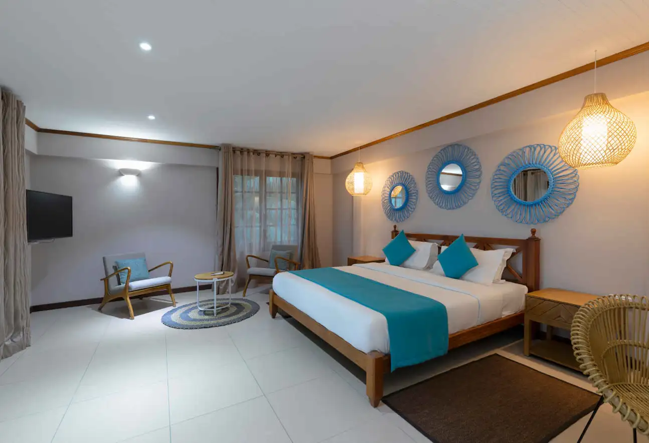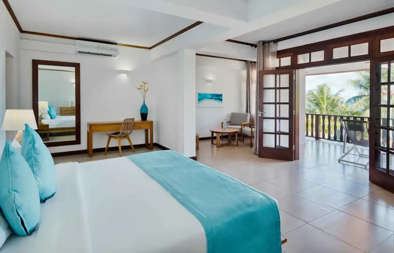 - Suite senior : Ces suites de 65 m² sont décorées avec un raffinement exquis, dans des tons blancs relevés de touches décoratives turquoise et agrémentées de meubles en bois, créant ainsi une véritable atmosphère de vacances. Leur agencement profite pleinement de la généreuse luminosité naturelle grâce aux baies vitrées qui s'ouvrent sur une terrasse aménagée avec un coin repas et des lits de plage individuels. Situées à quelques pas seulement de la plage, elles offrent une vue panoramique sur l'océan Indien qu’on l’on ne pourra se lasser de contempler. Conçues pour accueillir jusqu'à 3 personnes, ces suites spacieuses comprennent une grande chambre avec un lit king-size, d’un bureau, un grand dressing et un coin salon équipé d'un canapé. La salle de bains dispose d’une baignoire ainsi que d’une cabine de douche, de doubles vasques et de toilettes séparées.