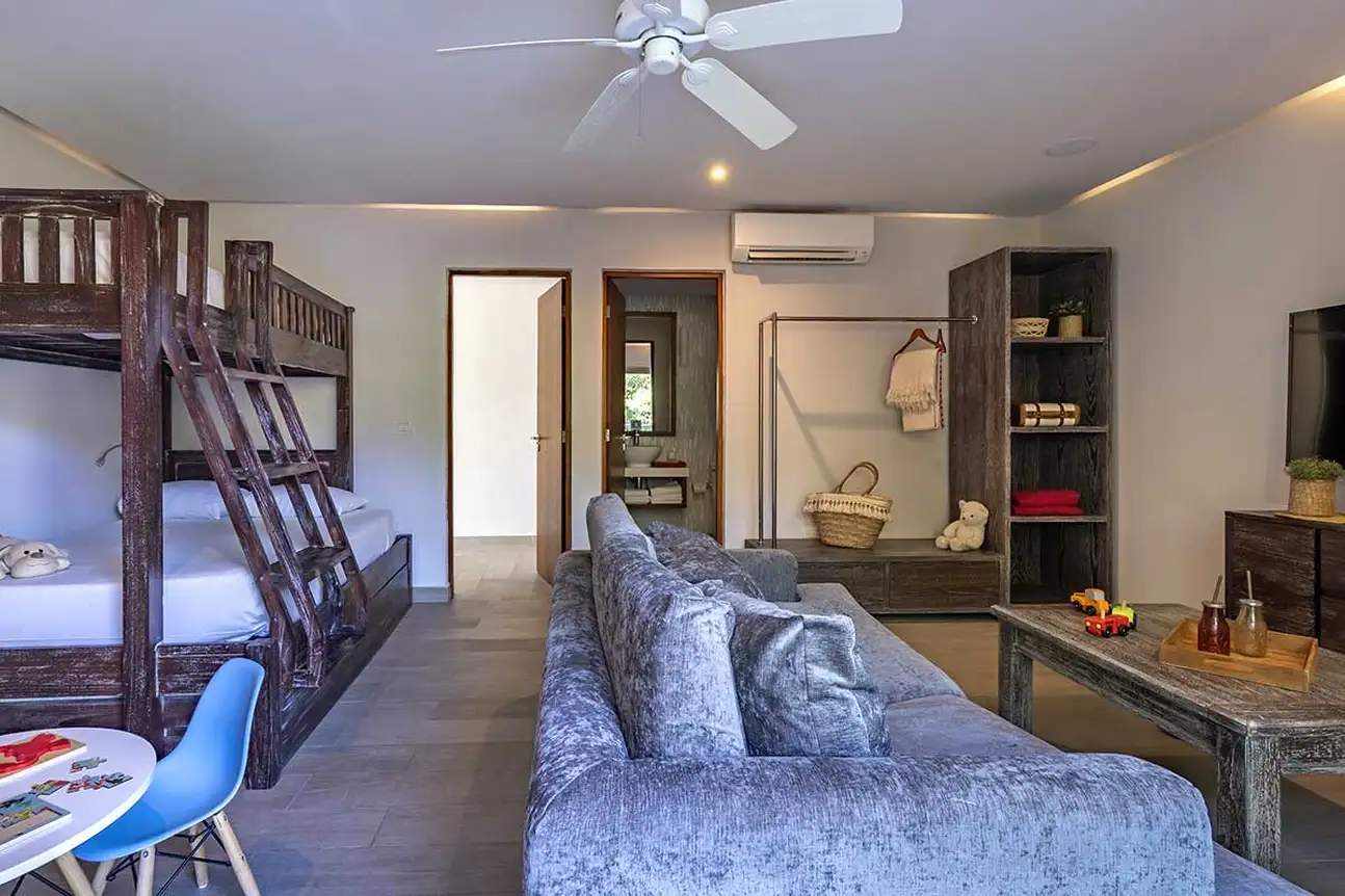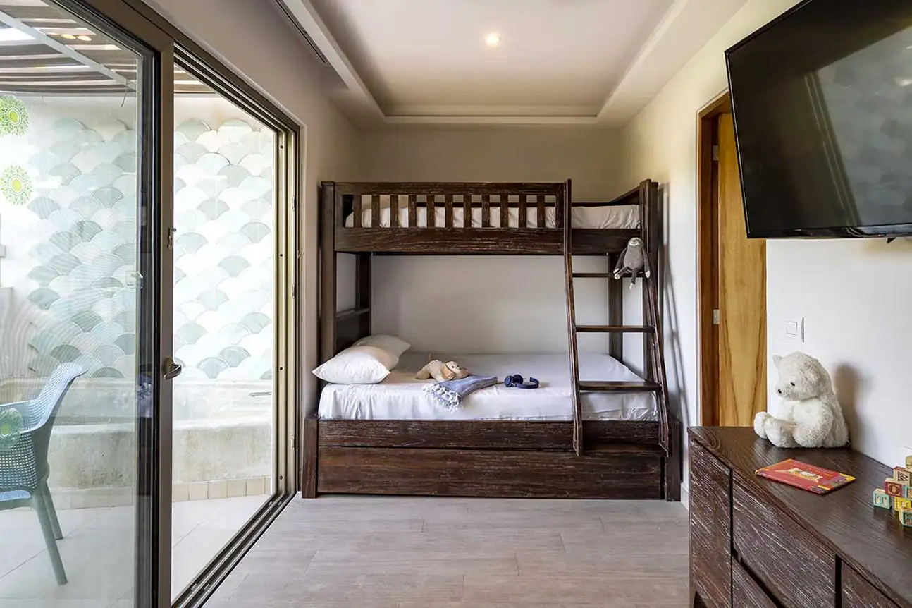 • Petite chambre attenante équipée de télévision et lits superposés avec lit gigogne
