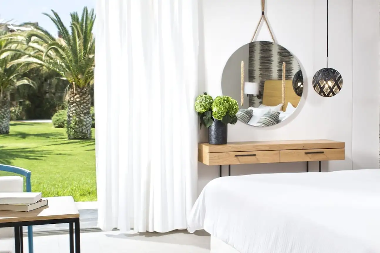 L'Agapi Beach Resort compte 188 chambres et suites, et 132 bungalows. De 18 à 60 m2, ils sont tous pourvus d'un balcon ou d'une terrasse avec vue jardin, piscine ou mer. Le bungalow Exclusive, c'est le top ! De la baie vitrée, vous accédez directement à la piscine calme entourée de jardins. Jolie, la déco avec cette grande tenture aux motifs traditionnels minoens. Ses tons rouges contrastent agréablement avec la blancheur du canapé près de la fenêtre. Petite touche design et culture avec le fauteuil Acapulco noir et les jarres aux dessins anciens sur l'étagère. Bel effort sur une ambiance crétoise...