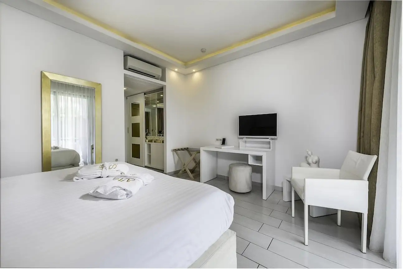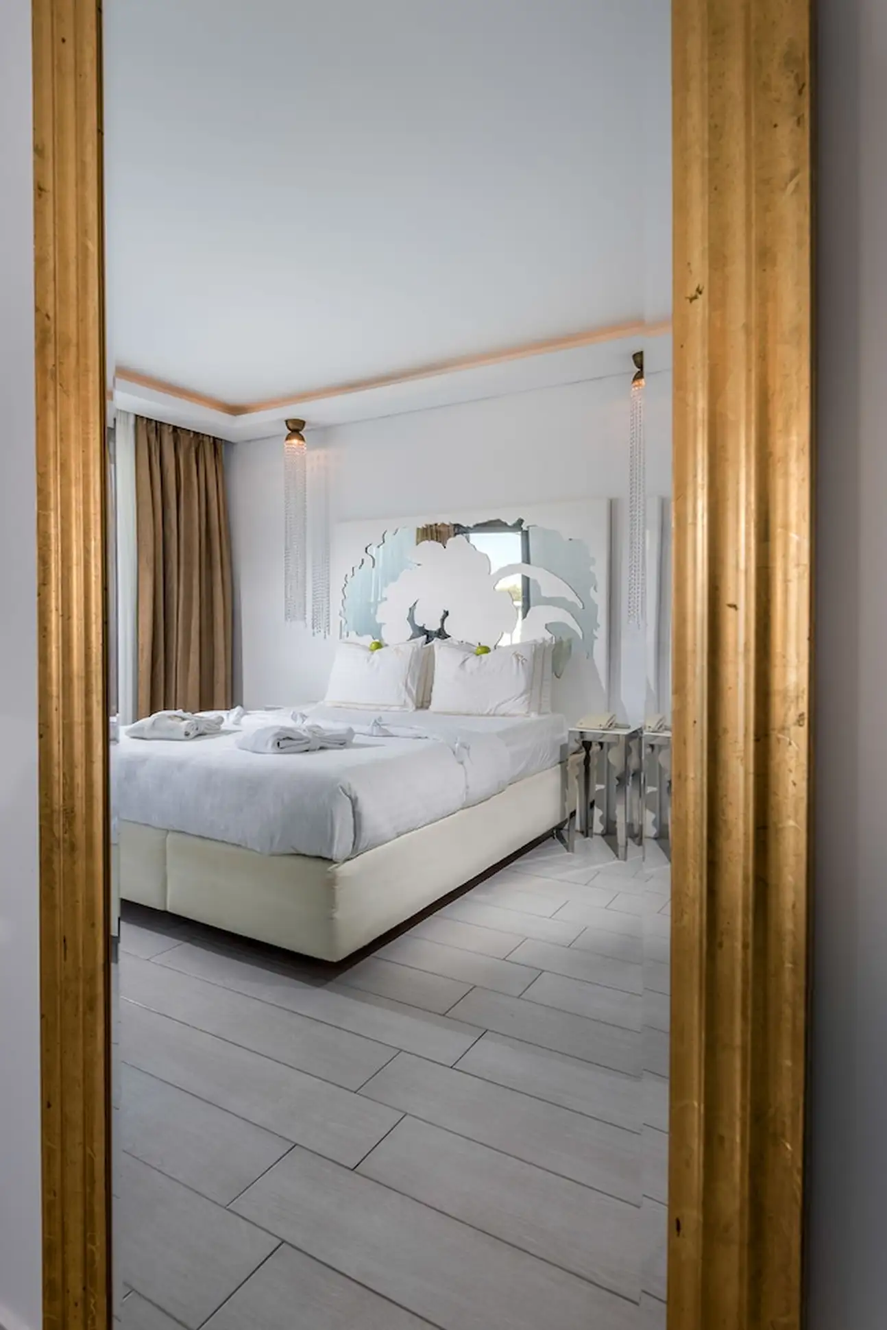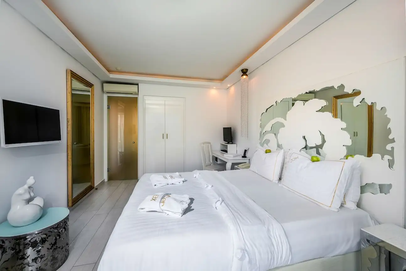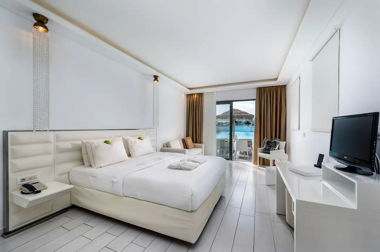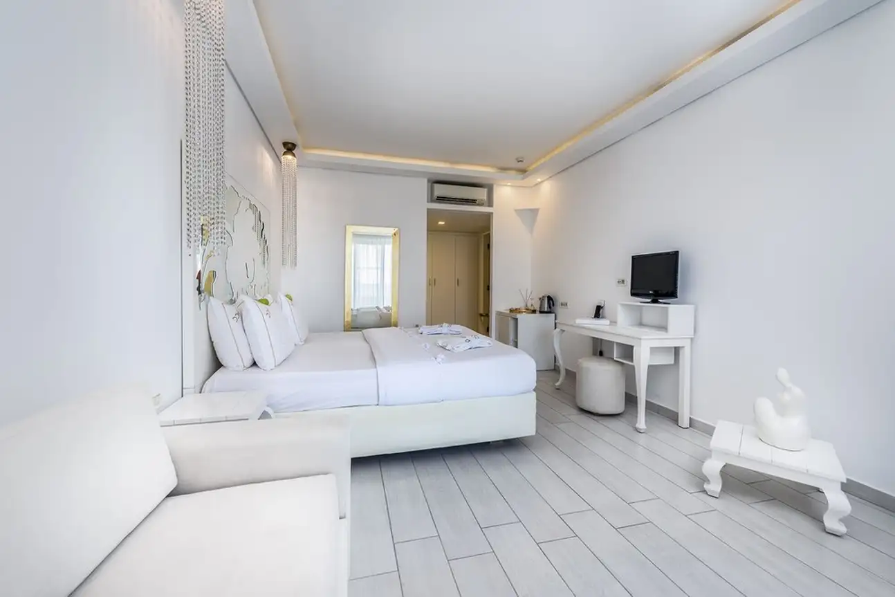 Votre resort totalise 110 chambres, allant de la Double Room de 30 m2 à la Diamond Suite with Private Pool de 60 m2, en passant par la Superior Deluxe de 38 m2. Toutes profitent d'espaces extérieurs meublés, avec vue mer ou piscine. On aime la Swim up, avec sa terrasse privée de 20 m2 et son accès direct à la piscine. C'est moderne et blanc de blanc ! Seul le doré s'invite sur les miroirs, les luminaires et les murs des salles de bain. Le mobilier est minimaliste. On adore l'œuf en balançoire en terrasse de la suite !