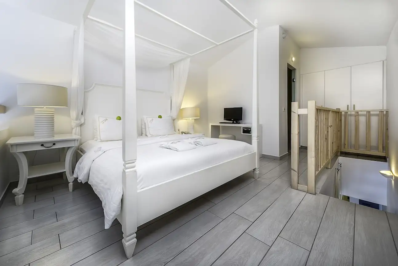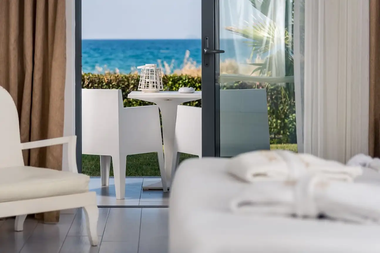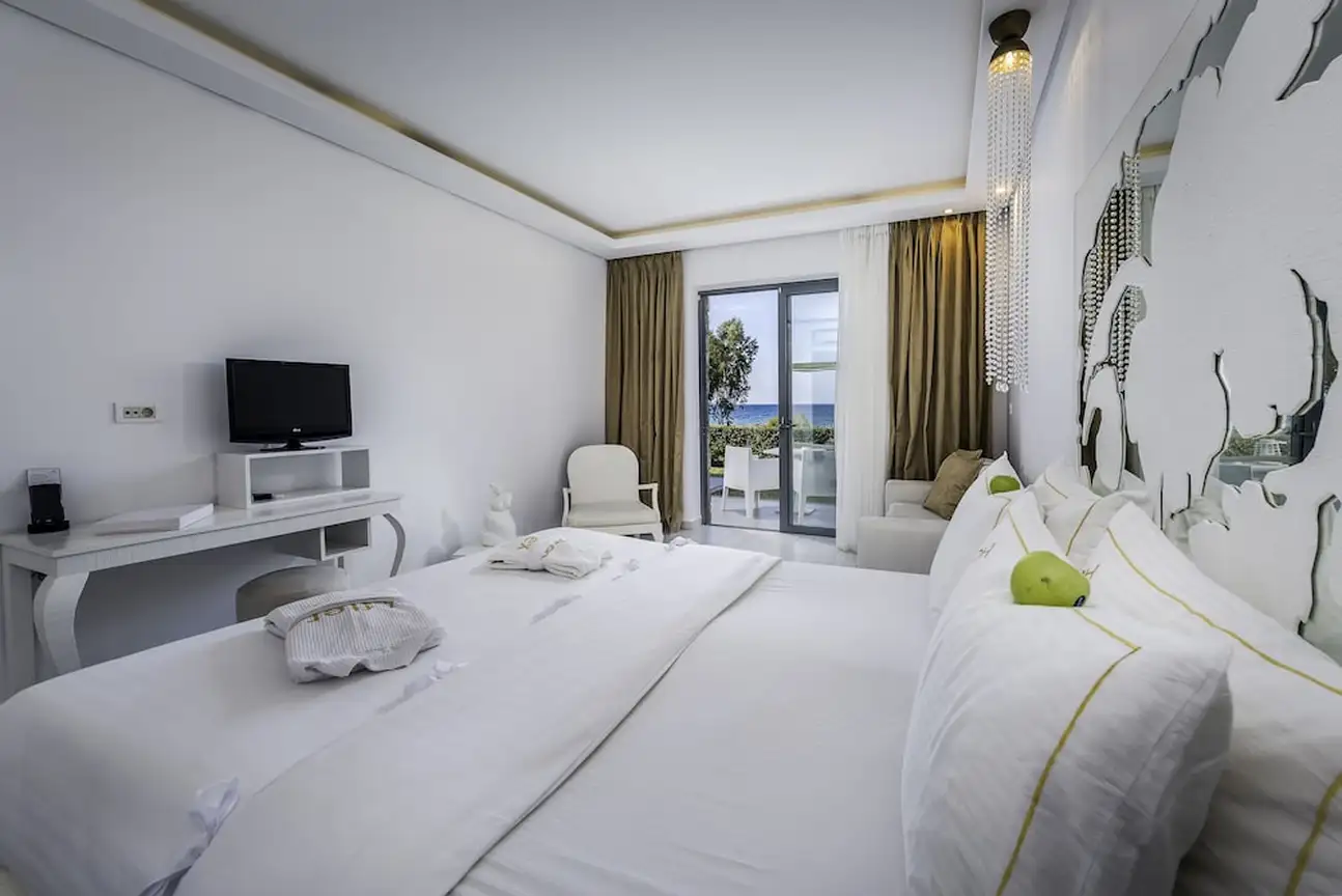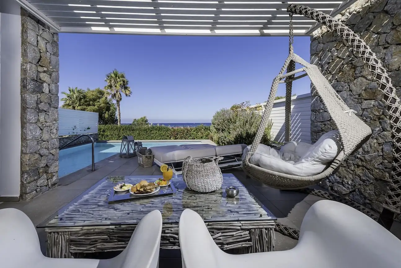 Votre resort totalise 110 chambres, allant de la Double Room de 30 m2 à la Diamond Suite with Private Pool de 60 m2, en passant par la Superior Deluxe de 38 m2. Toutes profitent d'espaces extérieurs meublés, avec vue mer ou piscine. On aime la Swim up, avec sa terrasse privée de 20 m2 et son accès direct à la piscine. C'est moderne et blanc de blanc ! Seul le doré s'invite sur les miroirs, les luminaires et les murs des salles de bain. Le mobilier est minimaliste. On adore l'œuf en balançoire en terrasse de la suite !