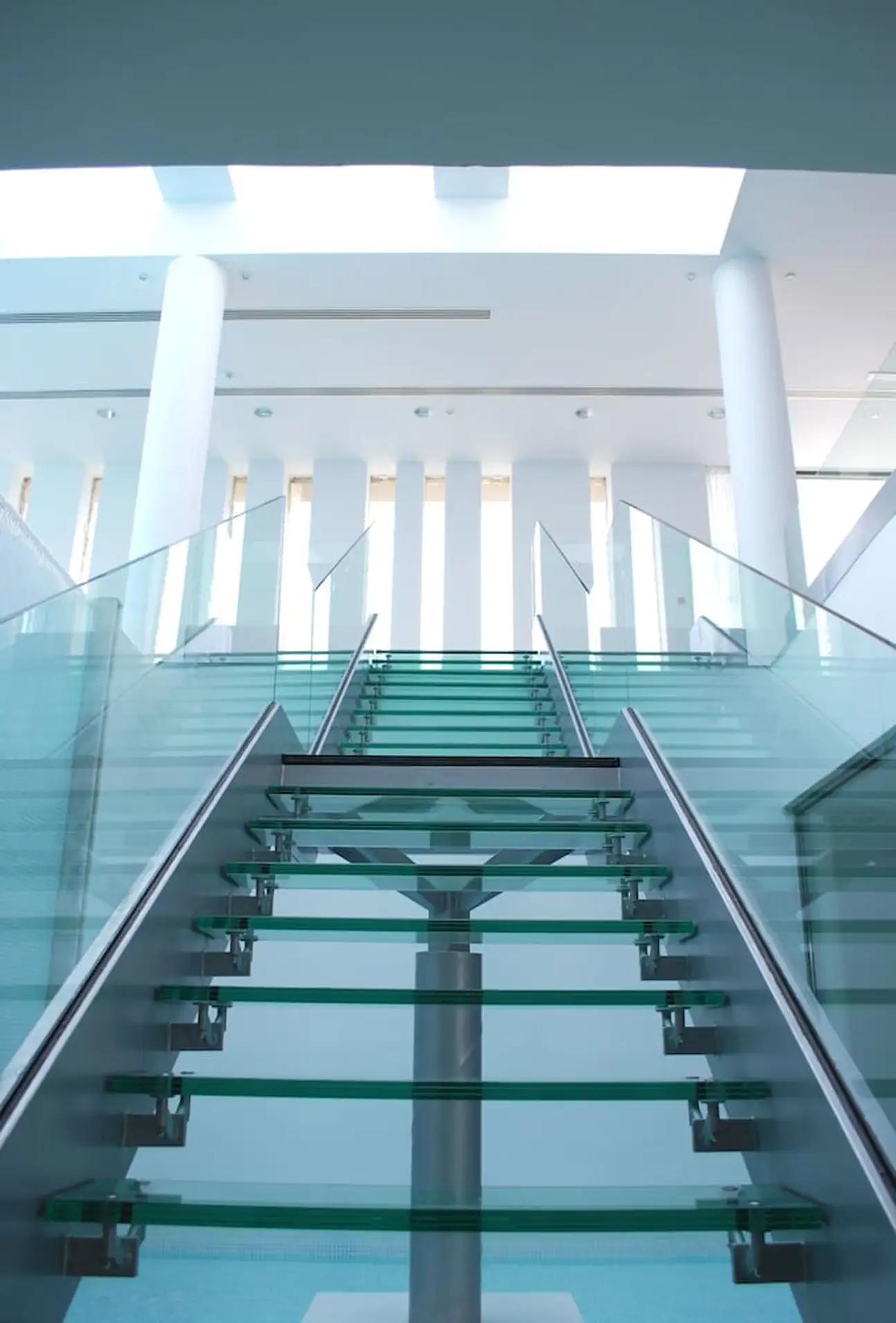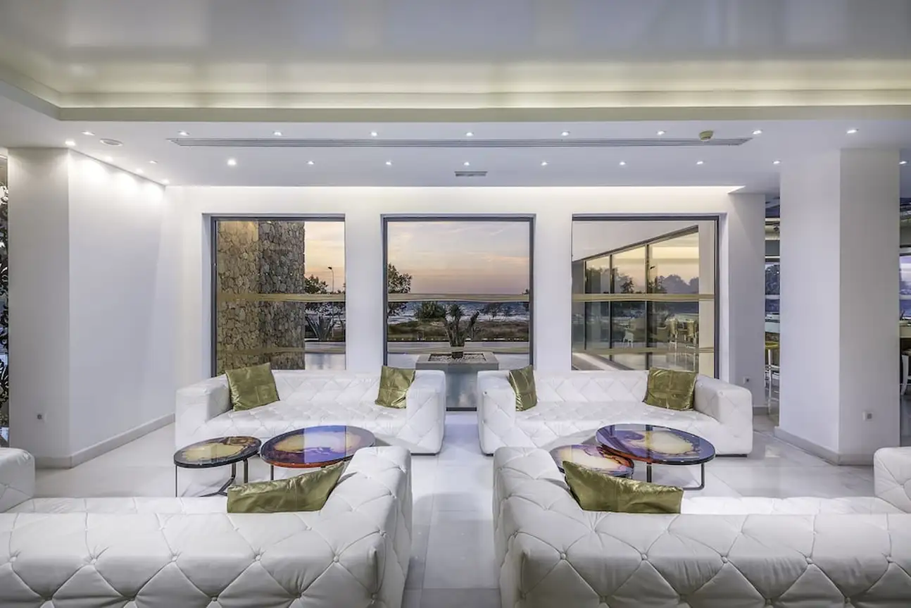 Glamour est sans doute l'adjectif qui qualifie le mieux ce resort sensoriel dédié au bien-être… Le design tantôt baroque tantôt contemporain transcende l'esthétique traditionnelle de ces constructions blanchies à la chaux. Des volumes simples mixent ici pierres apparentes et baies vitrées, organisés autour d'une vaste piscine scénographiée, où des fontaines jaillissent sous des lumières colorées en soirée. Des chaises longues campent sur des pontons qui avancent dans le bassin. Aux angles, des coins de pelouse accueillent des fauteuils en résine blanche de designers. Oliviers et parasols en feuilles de palme dépaysent. Inattendue, cette magnifique chapelle dédiée aux cérémonies de mariage. Dans les intérieurs, une lumière abondante sublime les sofas capitonnés tout blancs, ces chevaux dorés, emblèmes de l'hôtel, et les plafonds à miroirs. Un mur végétalisé apporte la touche de vert et une sculpture de femme, la touche de rouge. Pour plus de couleurs encore, le soleil couchant s'occupe de tout...
