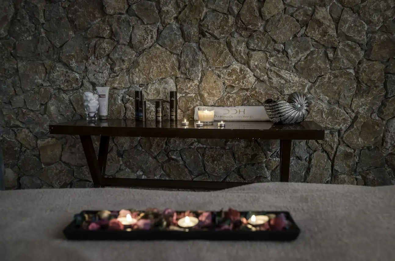 L'architecture du Diamond Deluxe respecte l'esprit de ces îles grecques caractéristiques avec l'utilisation de la pierre locale et de la couleur blanche. La boutique vous propose des gammes de vêtements et d'accessoires créés par de stylistes et designers grecs réputés tels que Katerina Loannidis et Kallos. L'île compte deux domaines que le restaurant de l'hôtel met en avant en servant les belles bouteilles de ces vignobles locaux. Tout ce que vous mangerez vient de fermes environnantes. Les fruits de mer arrivent du marché aux poissons du port de Kos.
