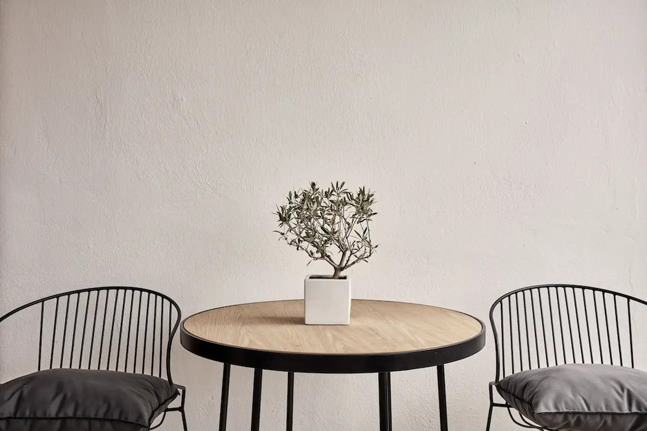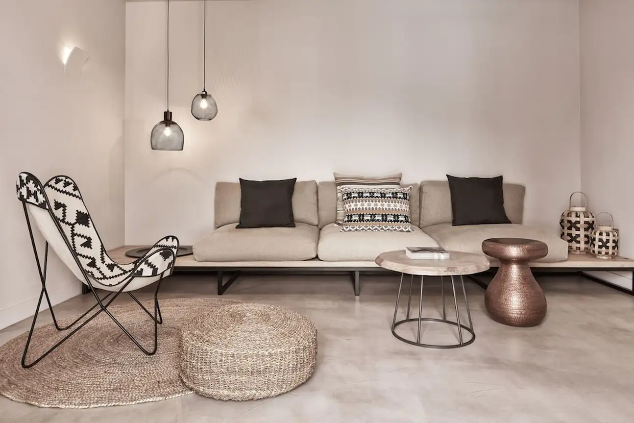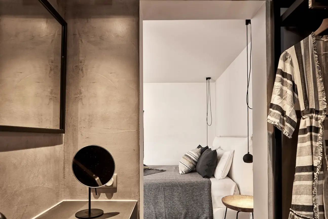Dépouillé le style bohème du Minos Beach Art hotel ! Pas trop de meubles dans les chambres, ni de couleurs. On joue ici sur les nuances de beige, brun et anthracite. A l'instar du fauteuil papillon noir et écru à motif traditionnel grec ou du pouf plat en raphia. Agréable, la salle de bains en béton brut avec son miroir horizontal. A défaut de pouvoir y poser toutes vos serviettes, l'échelle de bois fait de l'effet !