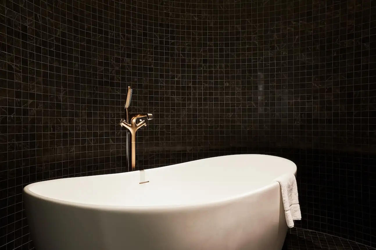 Mariant une palette de couleurs douces et naturelles en harmonie avec les détails art-déco de l'architecture, les panneaux de bois et les fauteuils en cuir évoquent plus un bureau de directeur (de banque), qu'une chambre. Sauf, quand la douche 100% marbre n'est séparée que d'une paroi de verre (intimité zéro).