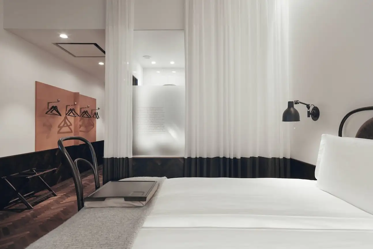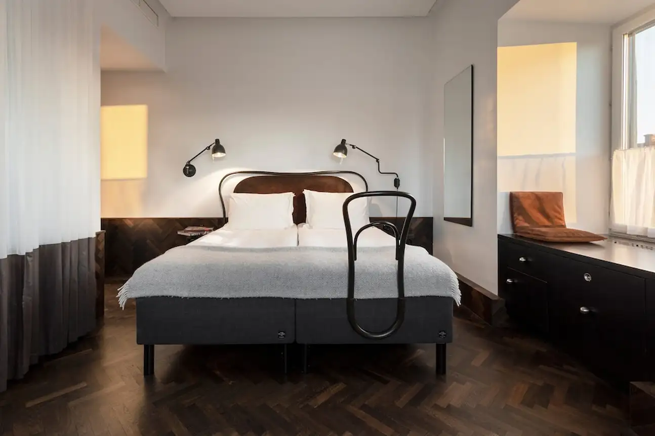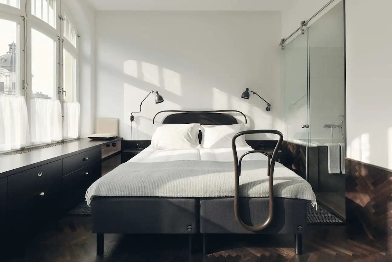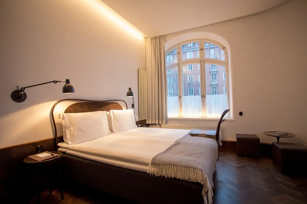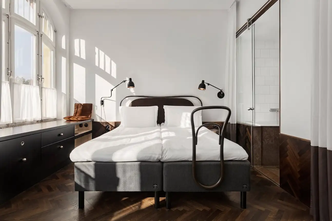 Et si on retournait à l'école le temps d'un week-end ? Ici, les matières à fort coefficient sont le design suédois et la gastronomie italienne. Les dalles en marbre portent encore les marques des centaines de jeunes filles qui se sont succédées dans les couloirs de l'Ateneum, leurs bouquins sous le bras... Miss Clara, c'est avant tout l'un des plus beaux bâtiments Art Nouveau de la ville, et à la base une école de filles très réputée. Son nom ? Un clin d'œil à sa directrice la plus mémorable, Clara Strömberg — engagée et défiant les normes. Pour accéder aux chambres, vous emprunterez l'escalier d'origine, vos bagages en guise de cartables. Le starchitecte local Gert Wingårdh a reconfiguré le bâtiment construit en 1910 en mélangeant habilement les détails Art Nouveau avec des touches plus modernes : des têtes de lit en bois courbé de la fabrique de meubles suédoise Gemla, des lampes en cristal Le Broom, des fauteuils Kaare Klint, des parquets de chêne teinté venant manger les hauts murs blancs... Et si les hauts plafonds et la blancheur omniprésente peuvent sembler froids et austères, de belles matières naturelles viennent réchauffer l’ambiance, comme les grands rideaux de coton sur les portes vitrées d'origine.