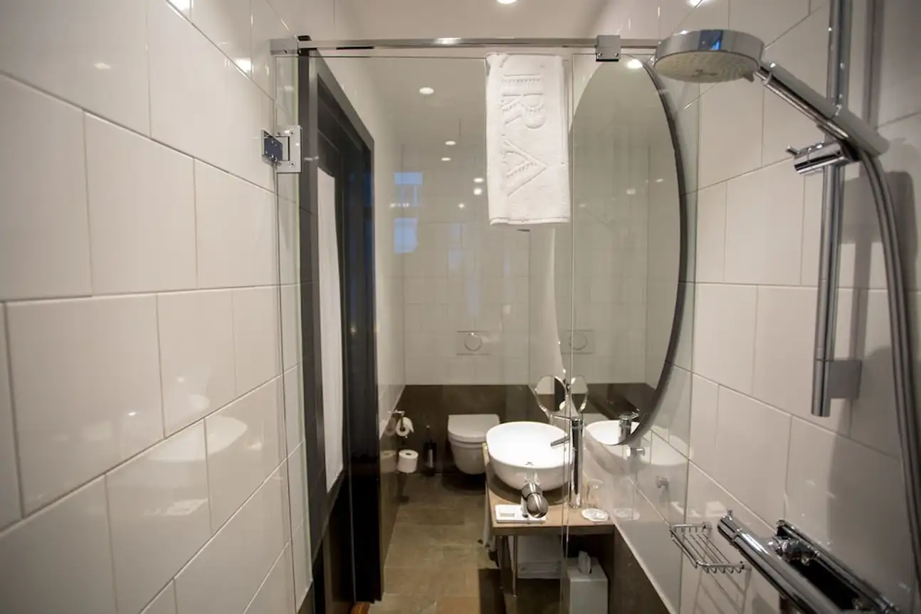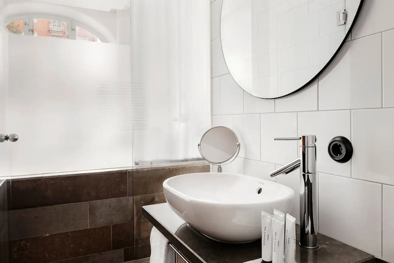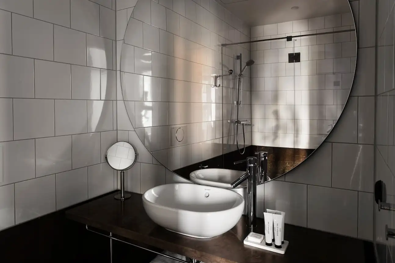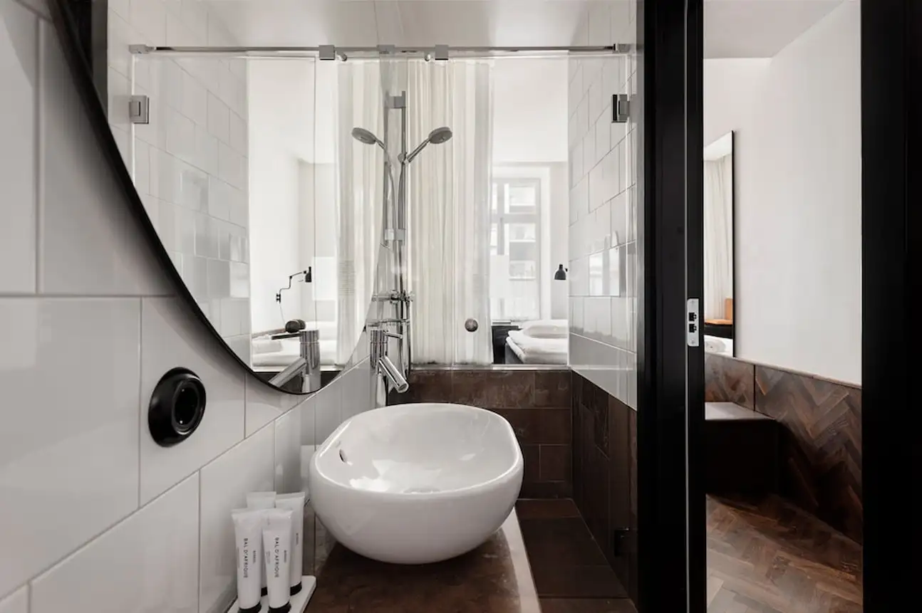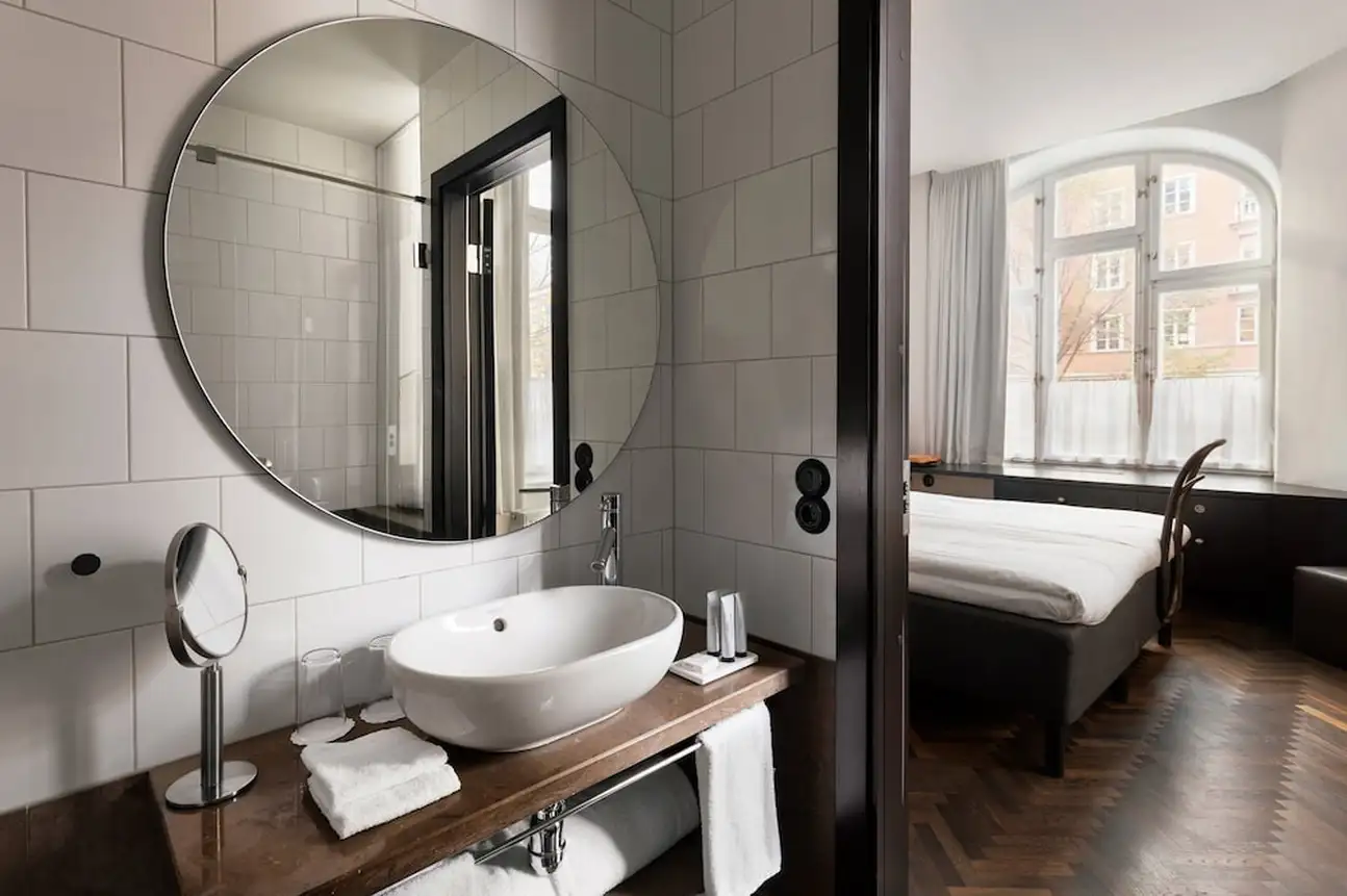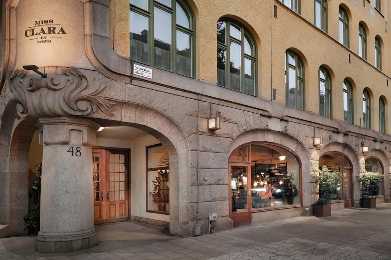 Et si on retournait à l'école le temps d'un week-end ? Ici, les matières à fort coefficient sont le design suédois et la gastronomie italienne. Les dalles en marbre portent encore les marques des centaines de jeunes filles qui se sont succédées dans les couloirs de l'Ateneum, leurs bouquins sous le bras... Miss Clara, c'est avant tout l'un des plus beaux bâtiments Art Nouveau de la ville, et à la base une école de filles très réputée. Son nom ? Un clin d'œil à sa directrice la plus mémorable, Clara Strömberg — engagée et défiant les normes. Pour accéder aux chambres, vous emprunterez l'escalier d'origine, vos bagages en guise de cartables. Le starchitecte local Gert Wingårdh a reconfiguré le bâtiment construit en 1910 en mélangeant habilement les détails Art Nouveau avec des touches plus modernes : des têtes de lit en bois courbé de la fabrique de meubles suédoise Gemla, des lampes en cristal Le Broom, des fauteuils Kaare Klint, des parquets de chêne teinté venant manger les hauts murs blancs... Et si les hauts plafonds et la blancheur omniprésente peuvent sembler froids et austères, de belles matières naturelles viennent réchauffer l’ambiance, comme les grands rideaux de coton sur les portes vitrées d'origine.