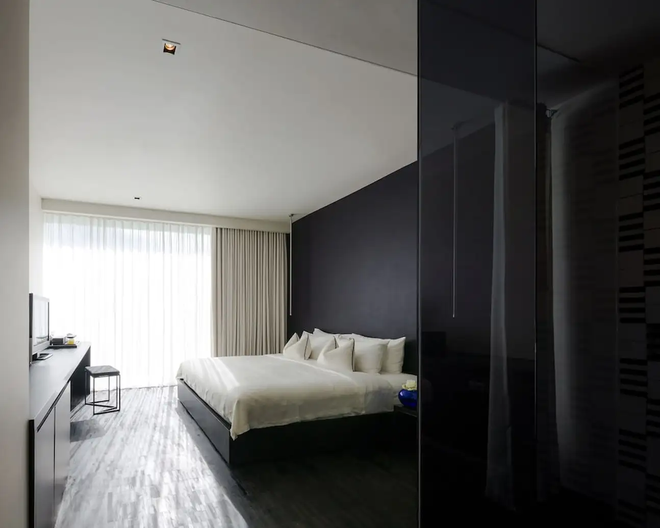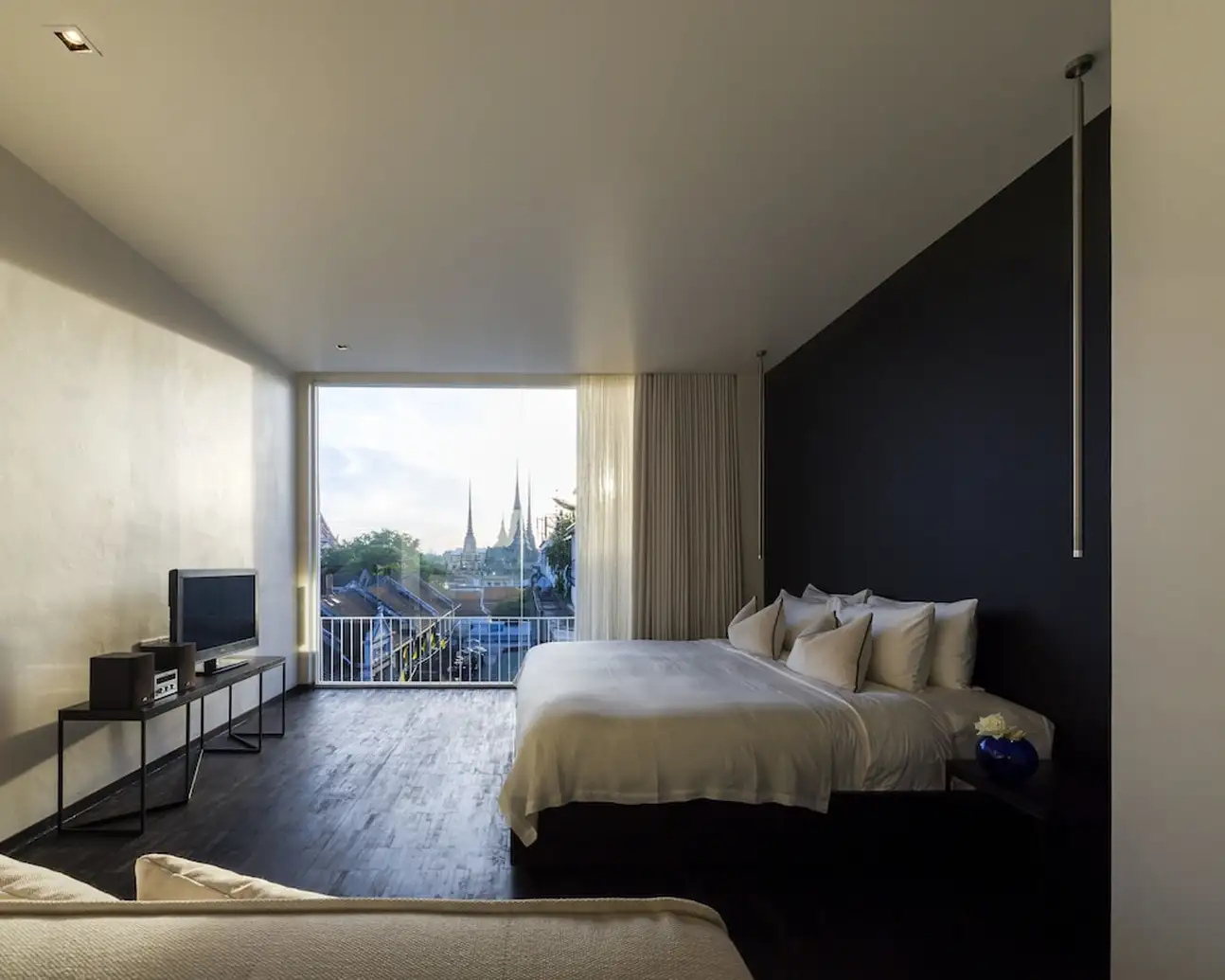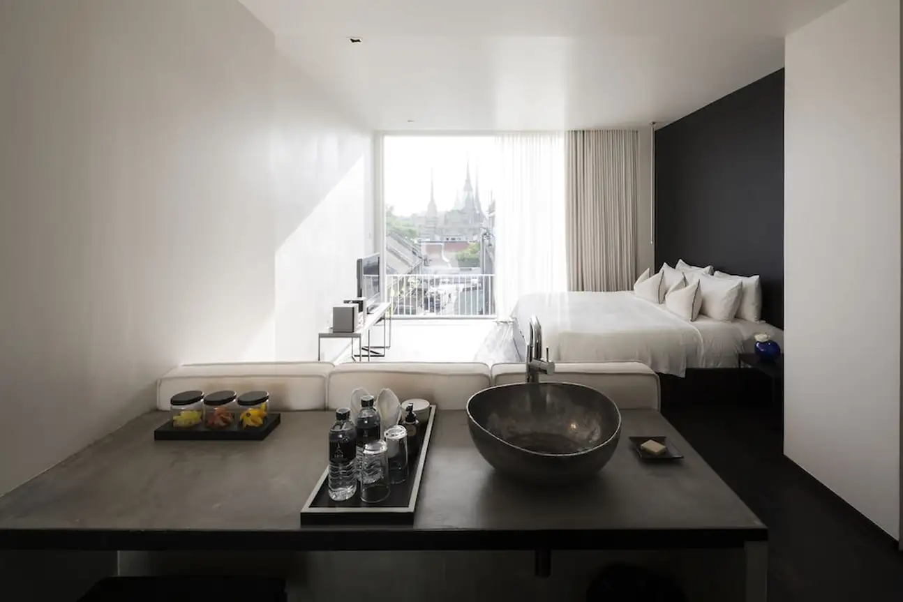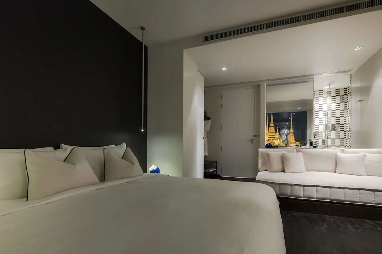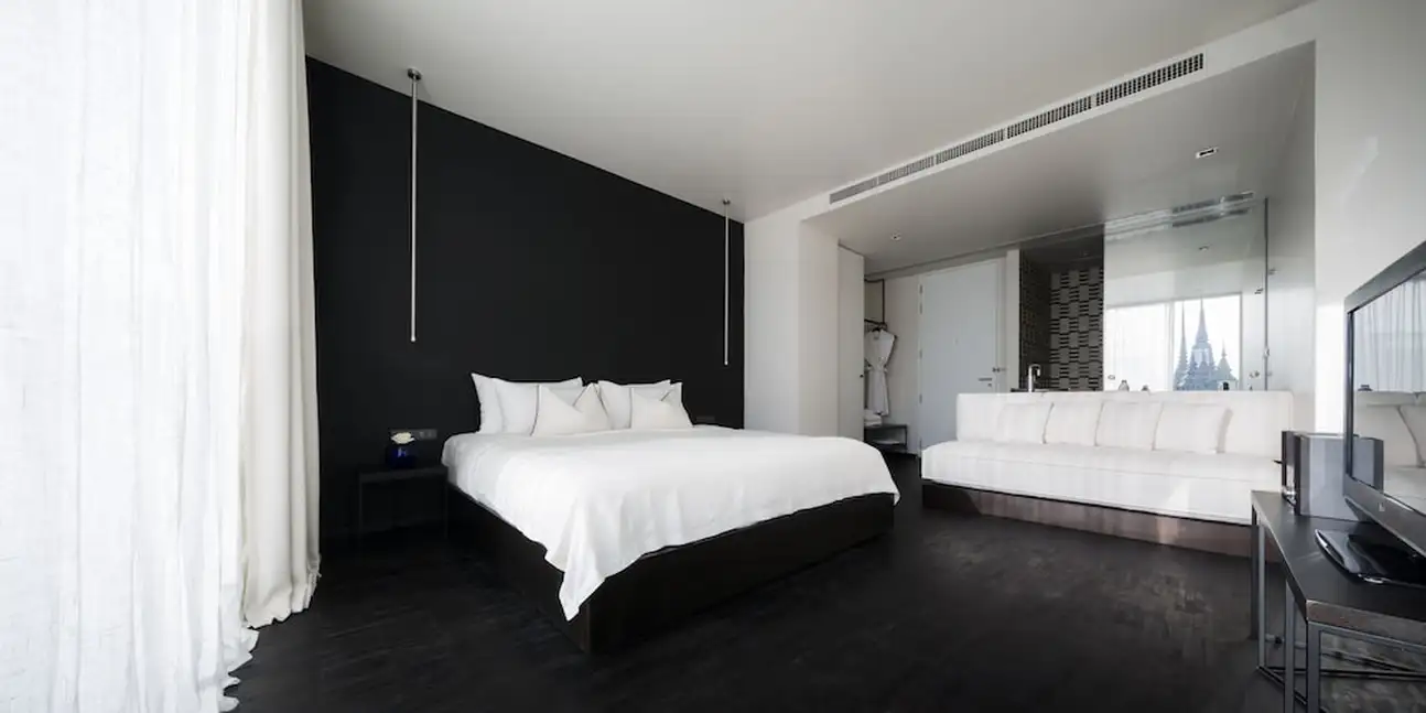 Même si la chambre standard possède déjà une belle surface de 25 m², vous auriez tort de ne pas profitez de la vue de la Wat Po Deluxe ou de la Wat Arun River View. Elles disposent aussi d’une belle superficie de 32 m² chacune. La déco en noir et blanc est très sobre, tout est dans l’élégance, même si cela manque un peu de détails. Ceci dit, la salle de bains a oublié d’être banale : elle est carrément intégrée à la chambre. La vasque du lavabo est posée au beau milieu de la pièce, face au lit. Et la douche se cache derrière un miroir en pied. Attention tout de même à ne pas faire prendre une douche au reste de la pièce…