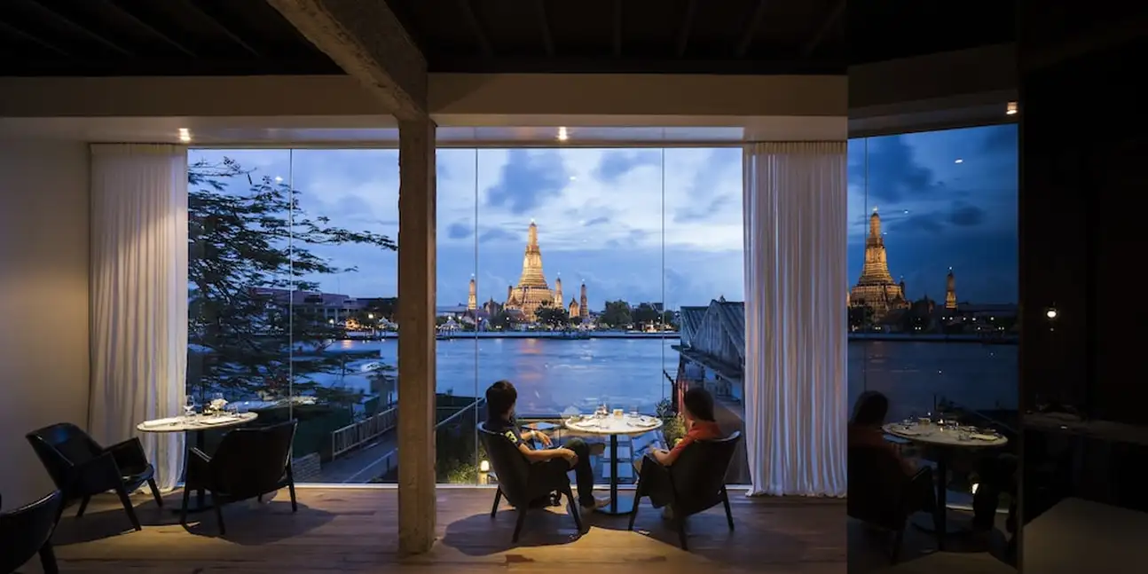 Vous profitez de la vue panoramique sur le Wat Arun même en prenant votre repas ! La déco contemporaine (mur en pierre, poutres apparentes et parquet foncé) offre d’ailleurs un joli contraste avec l’extérieur. La lumière tamisée, suspendue au-dessus de chaque table, met en valeur le contenu des assiettes. Le chef sud-africain vous a concocté une carte qui mélange les plats occidentaux avec les spécialités traditionnelles thaïes.