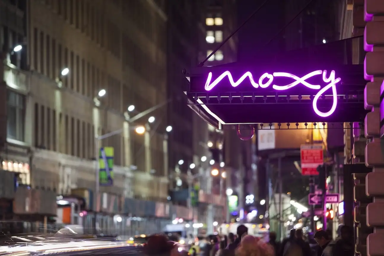 Arrivé à Times Square, l'enseigne fuchsia du Moxy attire tous les regards ! Une adresse qui n'a pas fini de briller et qui met tout le monde d’accord avec des prix imbattables et un look d’enfer. L’hôtel se la joue auberge de jeunesse branchouille, sur fond d'un chouette design signé Yabu Pushelberg. Le concept ? On vous laisse un minimum d’indépendance pour un maximum de liberté ! À vous de vous enregistrer lors du check-in, une machine sert des glaces all day long et vos plus beaux outfits évitent la case laundry avec un steamer à dispo dans votre dressing. Et où que vous posiez votre regard, les détails jouent avec vos nerfs, vous poussant à sortir votre téléphone à tout bout de champ. Nos scénographies favorites : les minis mosaïques des douches avec écrit « no diving » au sol, l’impressionnante sculpture d'ours lévitant au-dessus du lobby de l’artiste japonaise Sawada et surtout l'ambiance fête foraine en apesanteur dans les jardins du maxi rooftop. Inutile de chercher un spot pour déjeuner ou dîner, vous aurez l'embarras du choix : take-away à midi, brasserie plus tradi le soir et tapas sur le toit toute la nuit. Un cosmopolitain à la main, votre virée à New York n'a jamais autant été aussi stylée et vous non plus !