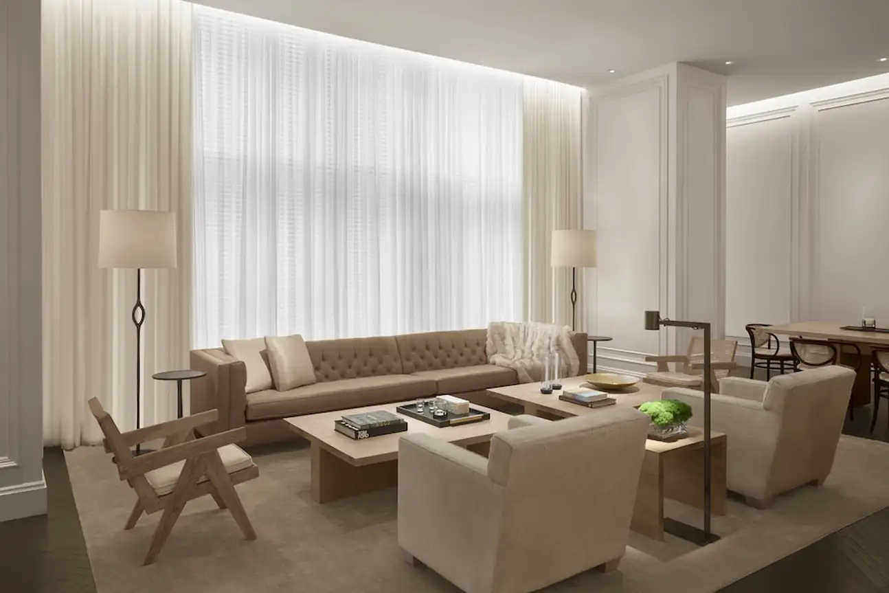Pour contrebalancer l'agitation folle du quartier, les chambres équilibrent le blanc et les tonalités boisées en dirigeant leurs éclairages là où on ne les attend pas. Résultat : une bulle de douceur, incroyablement silencieuse, pour des nuits d'exception. La vue sur New Nork est bien plus grande que la pièce et vous passerez des heures devant, emmitouflé dans votre plaid en fourrure avec un verre de vin sur les jolies tables basses au pied tulipe. Et sinon, un service d'épicerie livre tout ce qui pourrait vous être nécessaire.