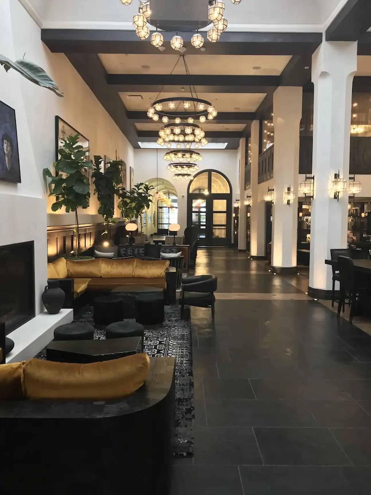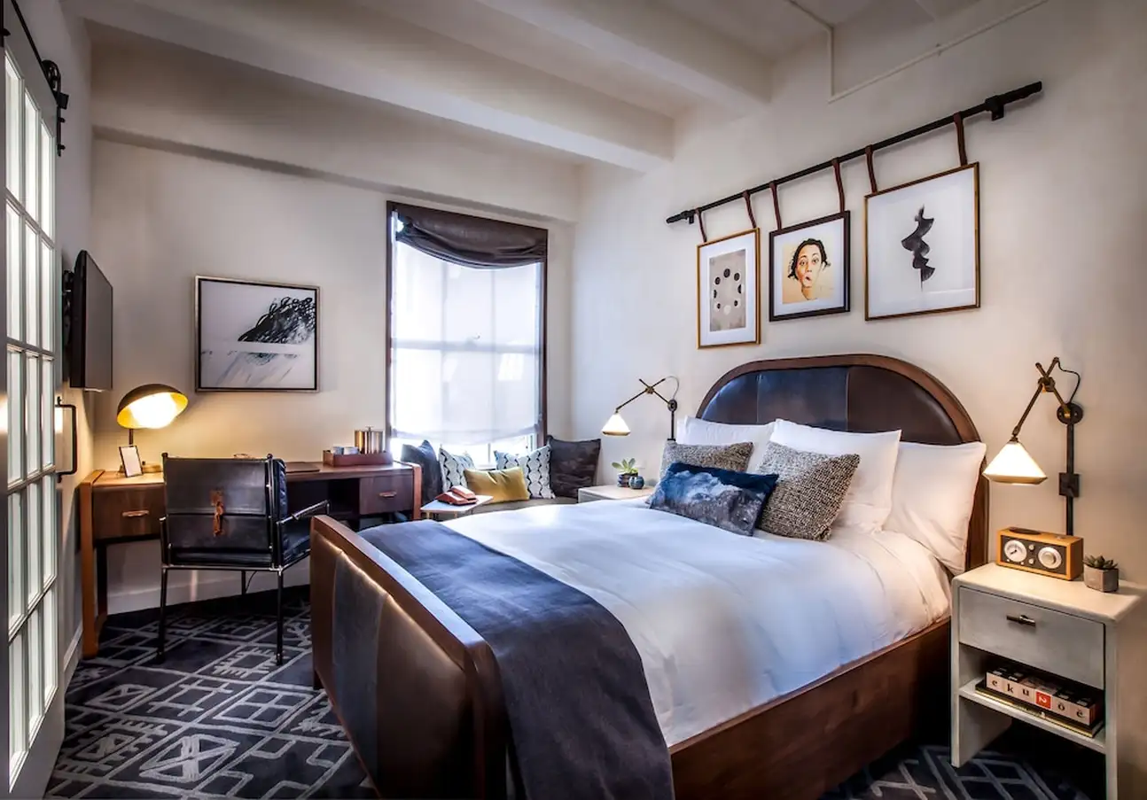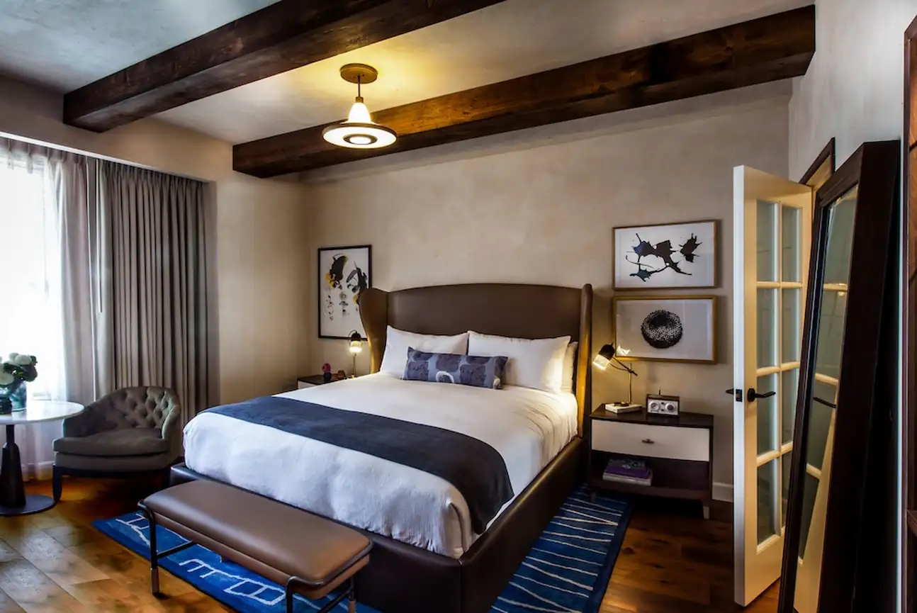 Depuis son ouverture en 1926, le Figueroa occupe une place à part dans l’histoire de la ville. Il a été fondé par l’organisation YWCA pour accueillir les femmes voyageant seules, à une époque où la plupart des hôtels les refusaient. Aujourd’hui encore, l’établissement reste fidèle à ses racines féministes. Il met régulièrement en avant les œuvres d’artistes et de créatrices locales. Une dominante artistique que vous retrouvez partout dans l’hôtel. Vu de l’extérieur, le building n’est pas époustouflant. Mais quand vous arrivez dans le lobby, vous avez l’impression de pénétrer dans une superbe demeure de style colonial espagnol. Hauts plafonds avec puits de lumière, cheminée, profusion de canapés, juxtaposition de matières et de textures. Comme si vous étiez dans une immense hacienda de luxe, richement décorée. Une impression qui persiste dans le patio extérieur à la végétation luxuriante. Devant vous, une incroyable piscine en forme de … cercueil. Mais rassurez-vous, l’endroit est plein de vie et même plutôt festif avec son bar et sa terrasse. Vous pouvez y prendre un super petit-déjeuner continental gratuit ! Dans votre chambre, la déco reprend le mélange d’inspiration coloniale espagnole et d’œuvres d’art. Avec quelques touches high-tech comme un iPad qui vous relie au room-service ou à la réception. Vous pouvez même réserver la Tesla maison mise à disposition pour vos déplacements dans un rayon d’1 mile !
