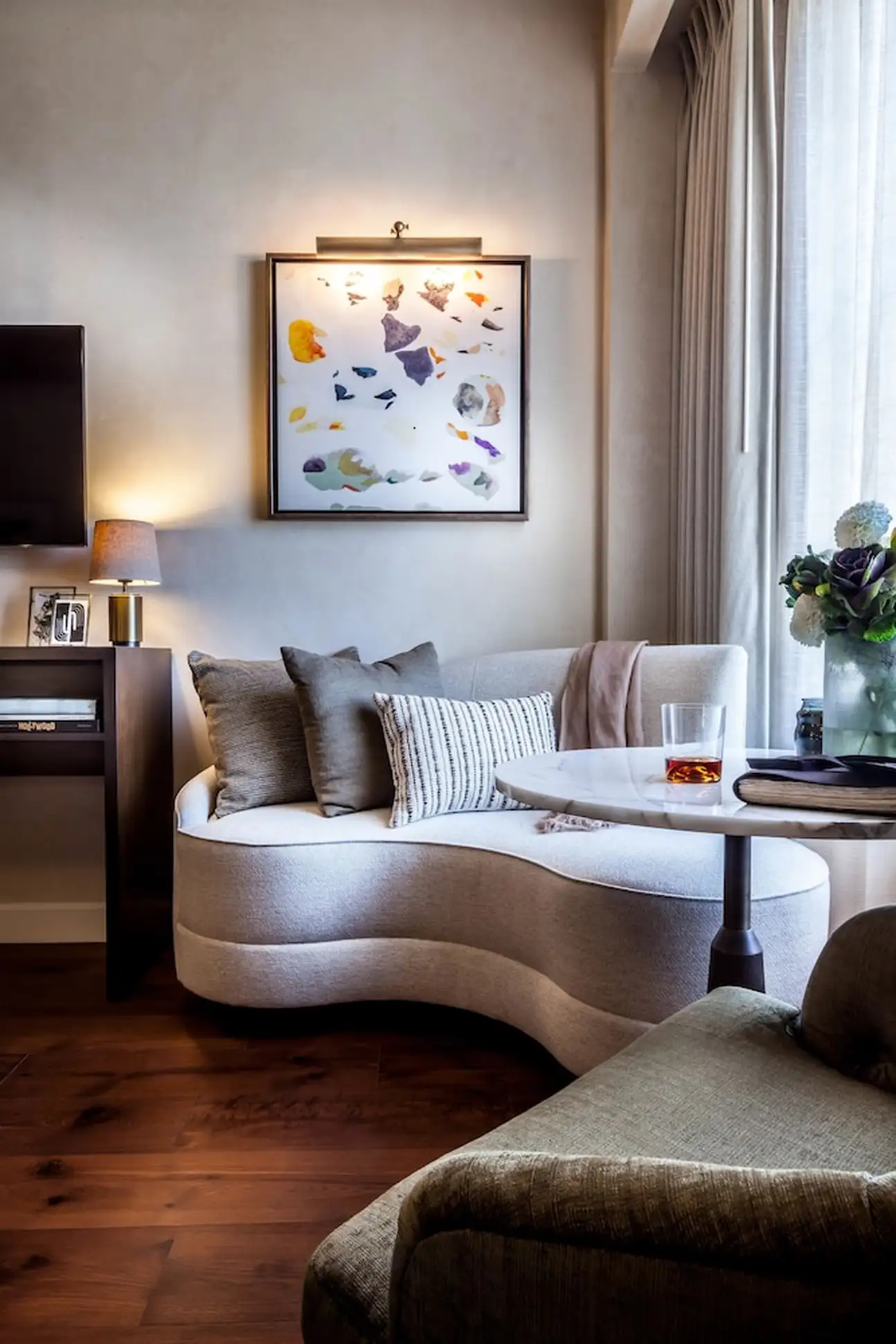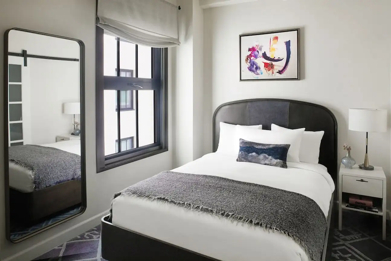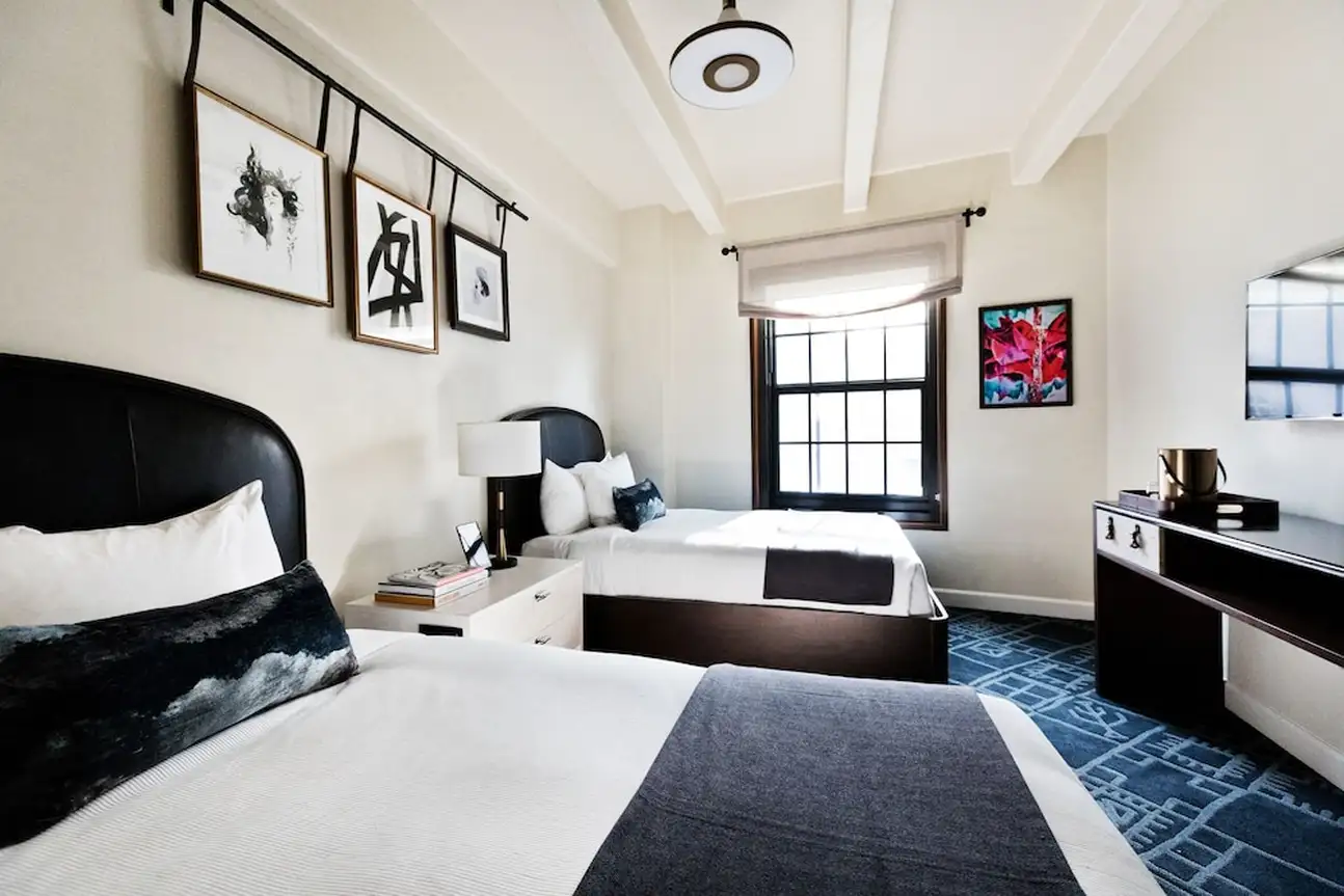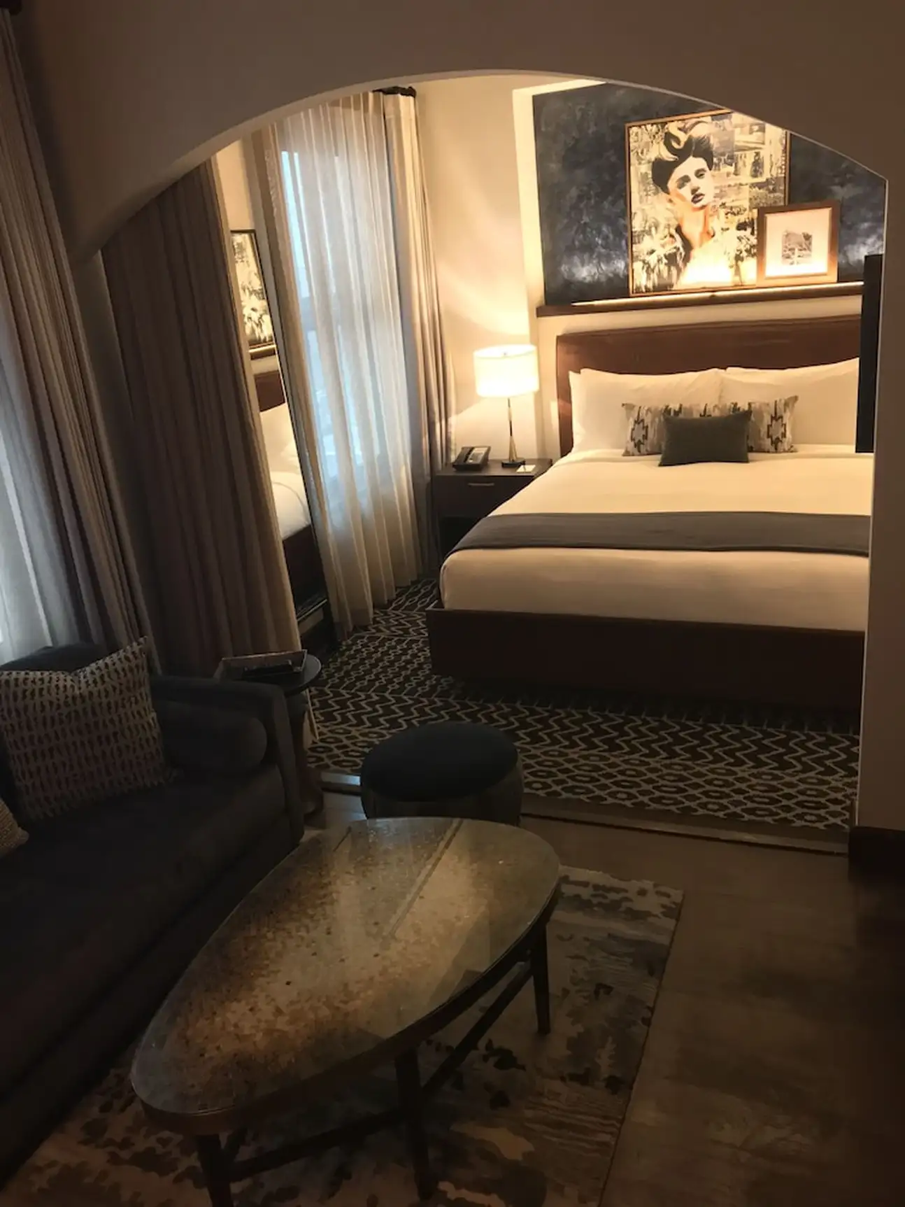 Depuis son ouverture en 1926, le Figueroa occupe une place à part dans l’histoire de la ville. Il a été fondé par l’organisation YWCA pour accueillir les femmes voyageant seules, à une époque où la plupart des hôtels les refusaient. Aujourd’hui encore, l’établissement reste fidèle à ses racines féministes. Il met régulièrement en avant les œuvres d’artistes et de créatrices locales. Une dominante artistique que vous retrouvez partout dans l’hôtel. Vu de l’extérieur, le building n’est pas époustouflant. Mais quand vous arrivez dans le lobby, vous avez l’impression de pénétrer dans une superbe demeure de style colonial espagnol. Hauts plafonds avec puits de lumière, cheminée, profusion de canapés, juxtaposition de matières et de textures. Comme si vous étiez dans une immense hacienda de luxe, richement décorée. Une impression qui persiste dans le patio extérieur à la végétation luxuriante. Devant vous, une incroyable piscine en forme de … cercueil. Mais rassurez-vous, l’endroit est plein de vie et même plutôt festif avec son bar et sa terrasse. Vous pouvez y prendre un super petit-déjeuner continental gratuit ! Dans votre chambre, la déco reprend le mélange d’inspiration coloniale espagnole et d’œuvres d’art. Avec quelques touches high-tech comme un iPad qui vous relie au room-service ou à la réception. Vous pouvez même réserver la Tesla maison mise à disposition pour vos déplacements dans un rayon d’1 mile !