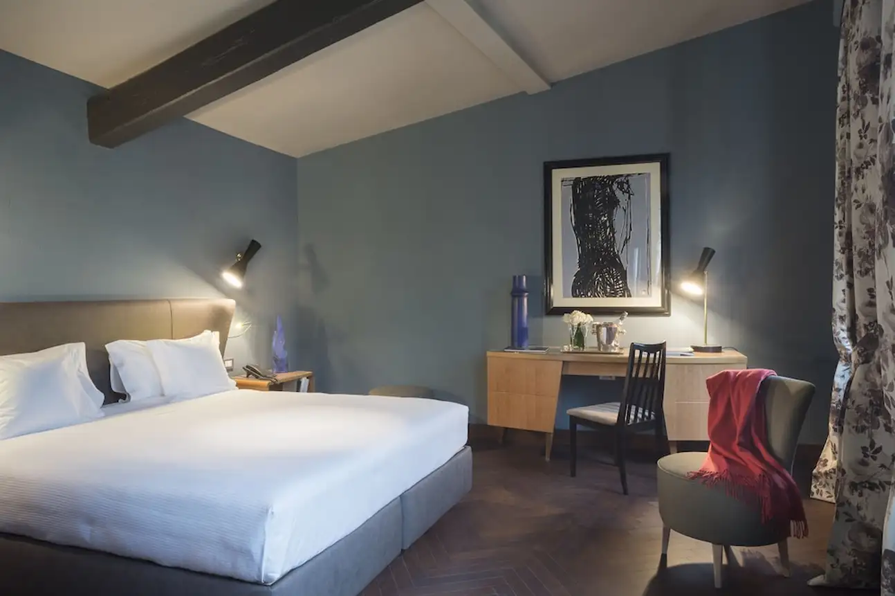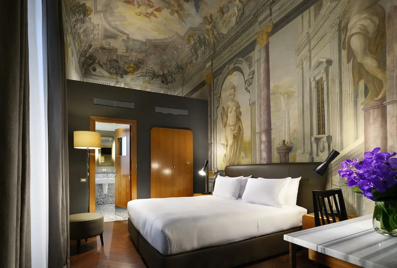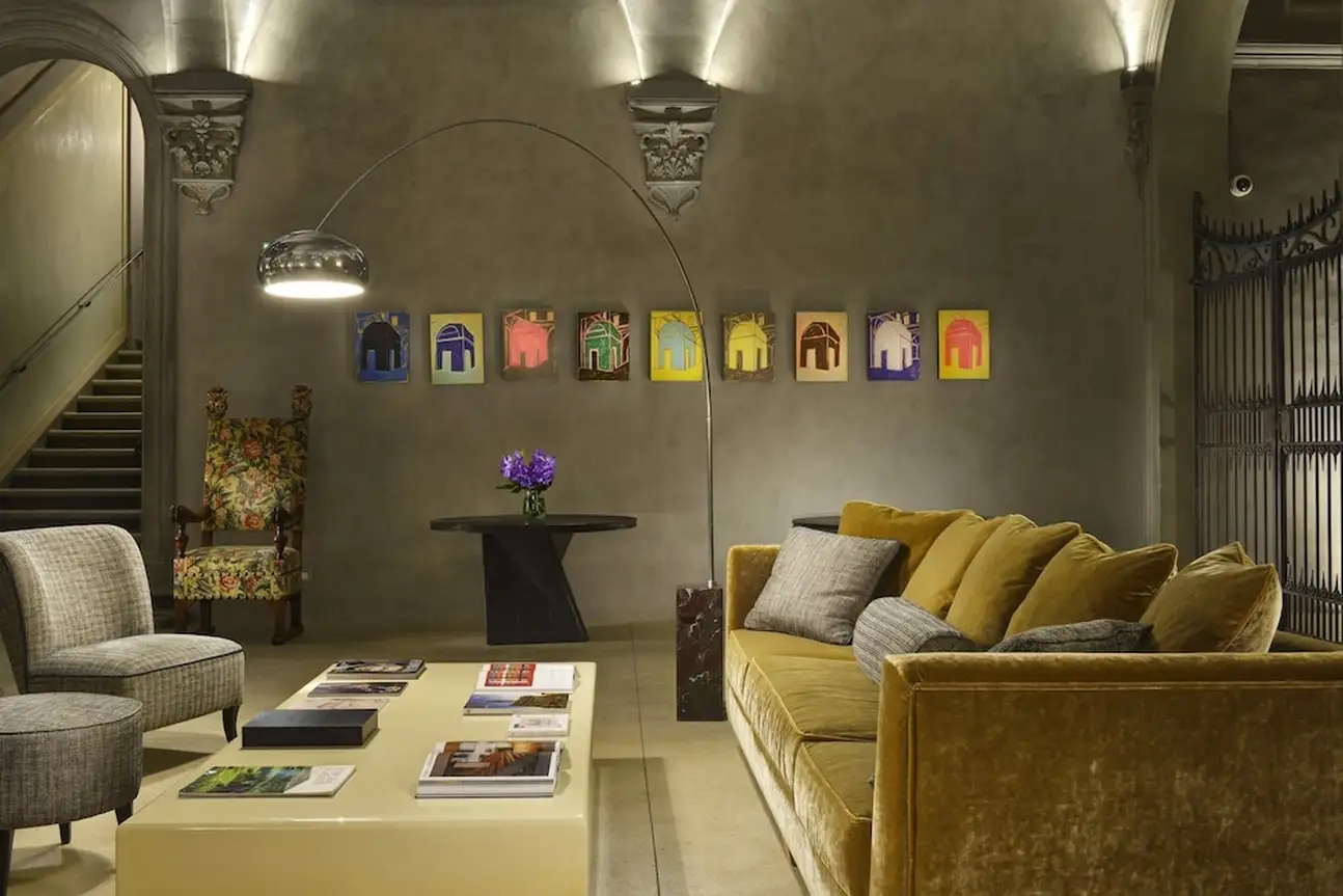 Vous aimez les belles demeures sans sacrifier à la modernité et une pointe de fantaisie n’est pas pour vous déplaire ? Bien central, l’hôtel Garibaldi Blu a investi un joli palais XIXe de la place Santa Maria Novella. S’il glisse ses deux étages entre deux immeubles de la même époque, l’intérieur joue l’effet de surprise. Et ce, dès le lobby au plafond scandé de voûtes. Aux colonnes d’époque répondent d’étranges palmiers noirs. Approchez-vous, ils sont fabriqués en gomme de pneu ! Des fauteuils, des canapé, un comptoir bar 1950, l’éclectisme est de mise et d’emblée, on se sent curieux. Les lieux recèlent-ils d’autres incongruités ? Oui, allez savoir pourquoi, des super-héros Marvel se sont glissés ça et là dans les couloirs de l’hôtel ! Et côté chambres ? Tout dépend de votre choix. Sobre élégance un brin masculine pour certaines avec leurs murs aux teintes douces et chaudes et meubles en bois brun rouge de Tanganika. Quand d’autres jouent sur l’effet de surprise avec d’authentiques fresques XIXe aux murs et au plafond. Avec un peu de chance, la vôtre contemple par la fenêtre, la très belle église Santa Maria Novella. Et la salle des petits-déjeuners avec son sol en damier et ses hautes banquettes tuftées est presque sage à côté !