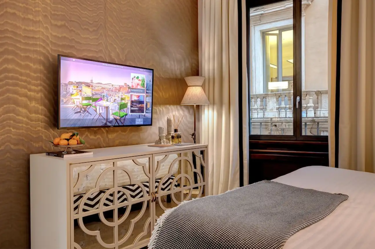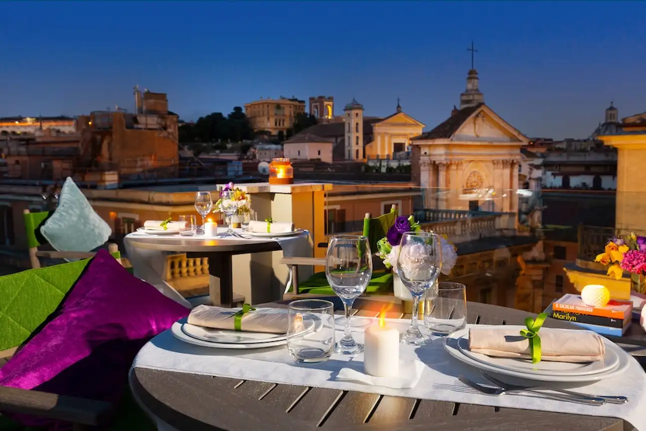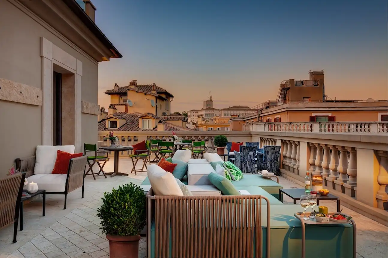 Un boutique hôtel authentique, élégant et moderne, dans lequel se cache une terrasse panoramique et sa sublime vue sur les toits de Rome.