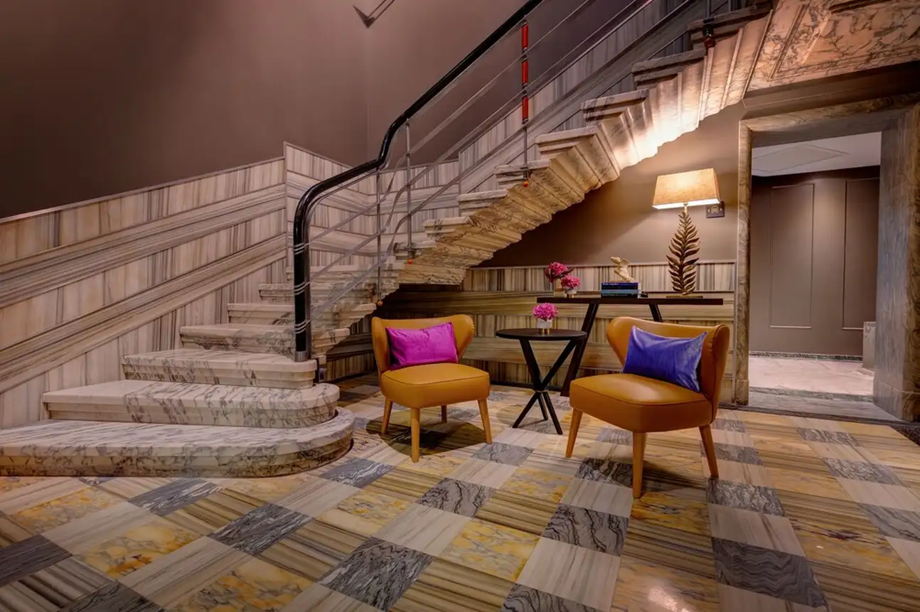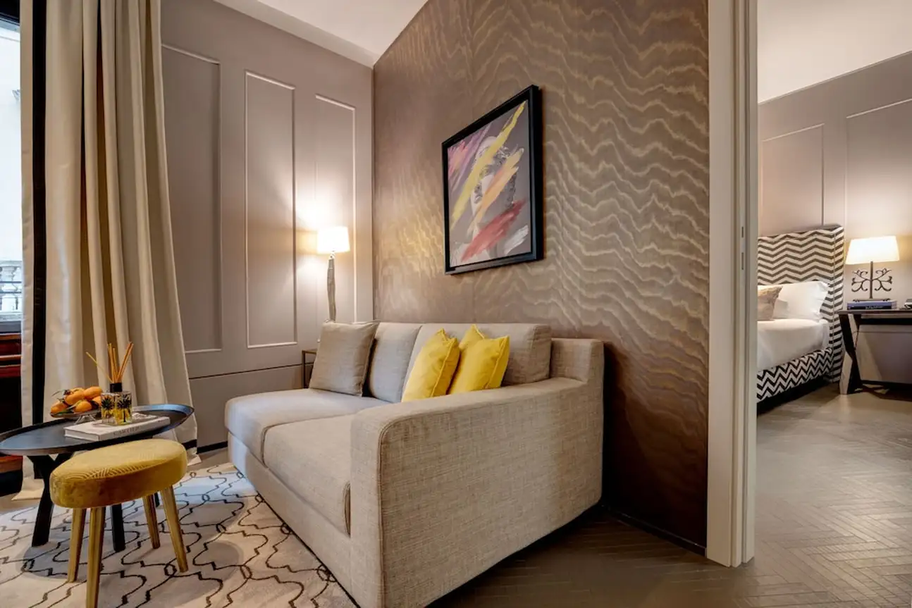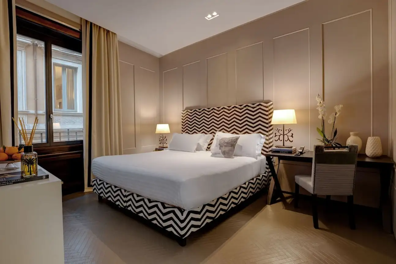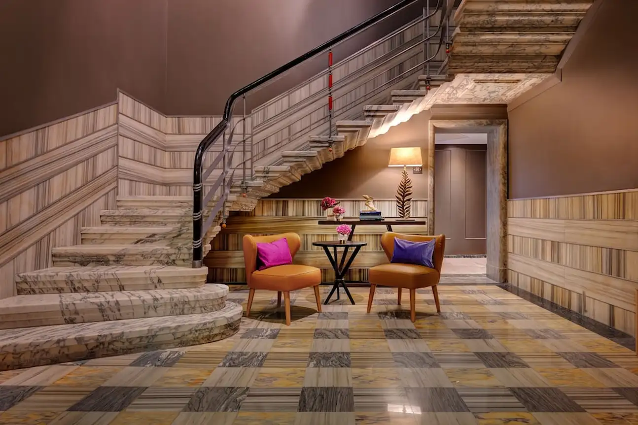 Tout simplement charmant ! Aménagé dans un édifice du 20ème siècle, le Singer Palace Hotel Rome se fond dans l’authenticité ambiante du Centro Storico. Dès l’entrée, l’escalier monumental en marbre gris et blanc vous fera kiffer. C’est le point stratégique de l’hôtel. En l’empruntant jusqu’au 5éme étage, il vous emmènera au restaurant Le Terrazze, avec ses banquètes en velours bleu et ses fauteuils en cuir moutarde. Sans oublier son extérieur : une grande terrasse en bois, parfaite pour un déj' avec une vue de fou sur les toits de Rome. Et en poursuivant votre ascension, jusqu’au dernier étage, vous découvrirez le Jim’s Bar, the rooftop ! Ici, on déguste des cocktails inspirés des années 20. Avec son comptoir en marbre noir et blanc et sa décoration ultra-design, l’atmosphère y est au contraire très contemporaine. Et le charme du Singer Palace n’a pas fini d’opérer. Dans les chambres et les suites la décoration mixe modernité et authenticité, en alliant mobilier contemporain et parquet à chevrons, agrémenté de tissus d’ornement en lin, velours et coton. Le plus dur sera de choisir : vous relaxer dans la Terrace Suite, avec son extérieur paysagé donnant sur la cour intérieure de l’hôtel, au calme et en toute intimité ? Ou vous emballer façon Dolce Vita avec la Suite S. Ignazio, quarante mètres carrés avec salon et une vue unique sur l’église baroque Saint-Ignace de Loyola ? À vous de voir !