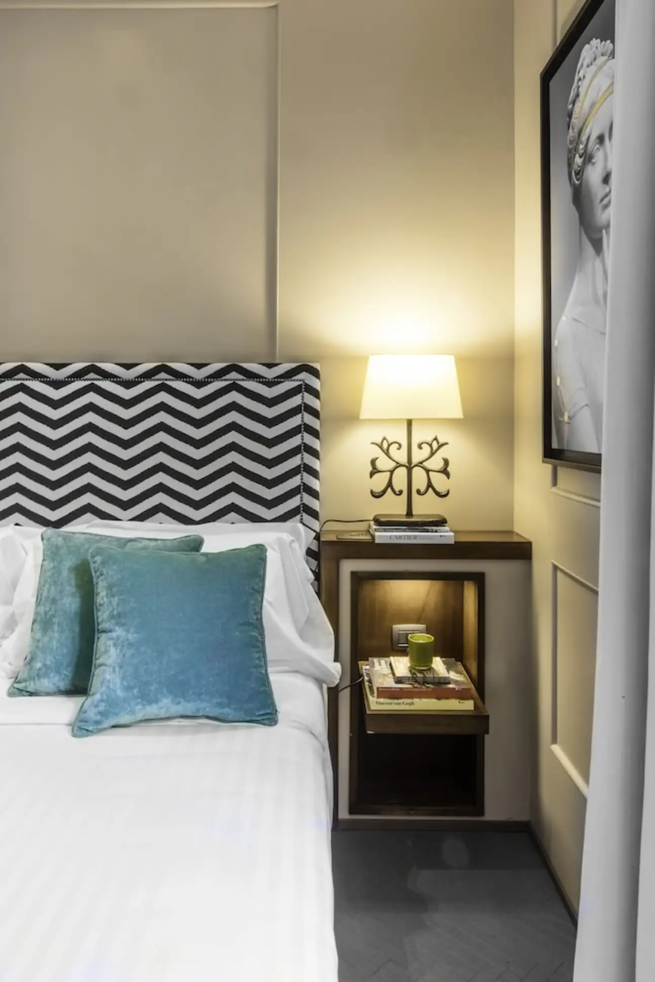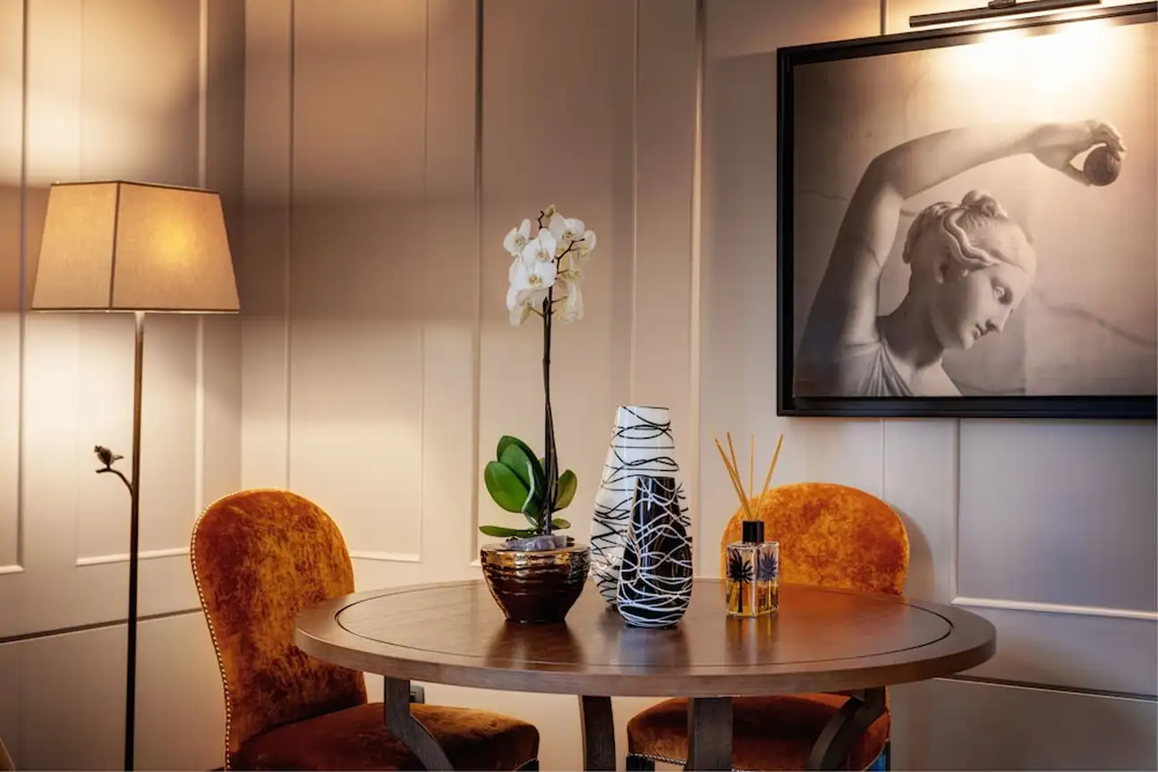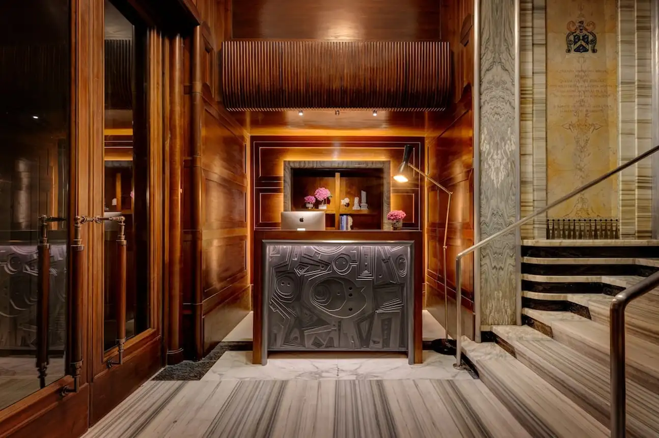 Tout simplement charmant ! Aménagé dans un édifice du 20ème siècle, le Singer Palace Hotel Rome se fond dans l’authenticité ambiante du Centro Storico. Dès l’entrée, l’escalier monumental en marbre gris et blanc vous fera kiffer. C’est le point stratégique de l’hôtel. En l’empruntant jusqu’au 5éme étage, il vous emmènera au restaurant Le Terrazze, avec ses banquètes en velours bleu et ses fauteuils en cuir moutarde. Sans oublier son extérieur : une grande terrasse en bois, parfaite pour un déj' avec une vue de fou sur les toits de Rome. Et en poursuivant votre ascension, jusqu’au dernier étage, vous découvrirez le Jim’s Bar, the rooftop ! Ici, on déguste des cocktails inspirés des années 20. Avec son comptoir en marbre noir et blanc et sa décoration ultra-design, l’atmosphère y est au contraire très contemporaine. Et le charme du Singer Palace n’a pas fini d’opérer. Dans les chambres et les suites la décoration mixe modernité et authenticité, en alliant mobilier contemporain et parquet à chevrons, agrémenté de tissus d’ornement en lin, velours et coton. Le plus dur sera de choisir : vous relaxer dans la Terrace Suite, avec son extérieur paysagé donnant sur la cour intérieure de l’hôtel, au calme et en toute intimité ? Ou vous emballer façon Dolce Vita avec la Suite S. Ignazio, quarante mètres carrés avec salon et une vue unique sur l’église baroque Saint-Ignace de Loyola ? À vous de voir !