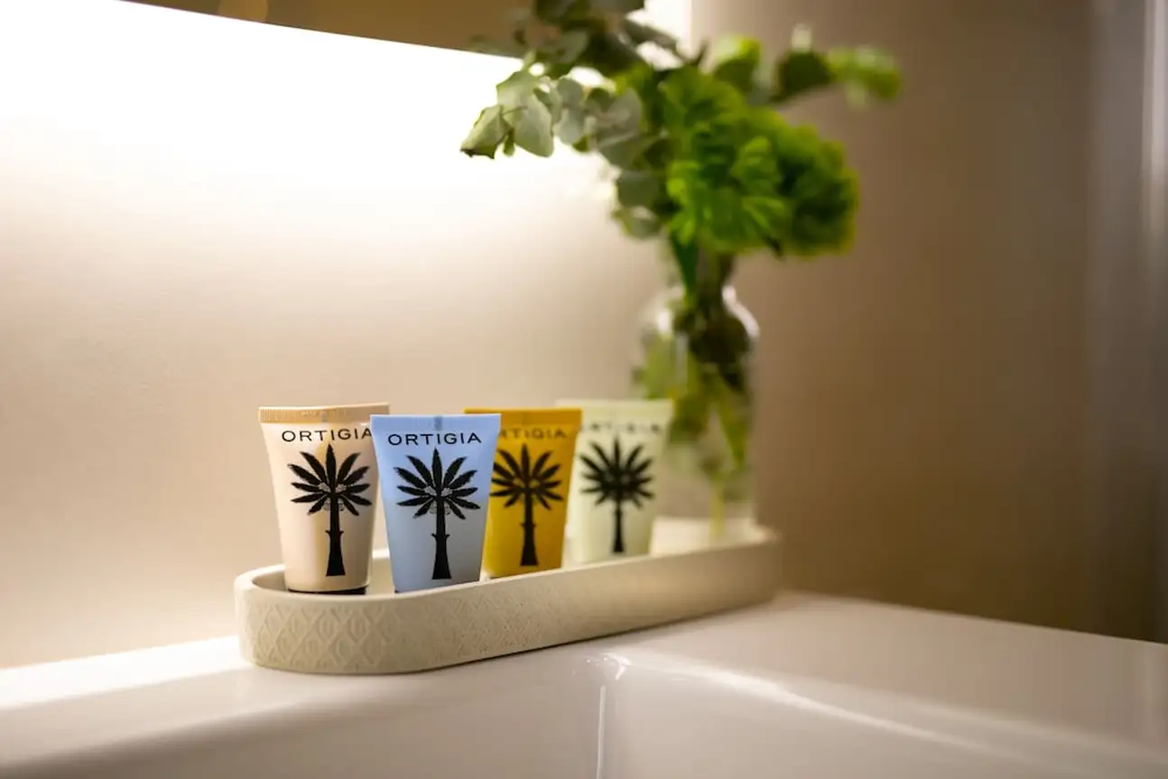 Les shampoing et savons présents dans les salles de bains sont signés Ortigia, une entreprise sicilienne familiale créée en 2006 par Sue Townsend. La marque travaille avec des produits naturels spécifiques à la Sicile et distillés par un maître parfumeur, Lorenzo Villoresi. Les produits sont garantis sans nickel, sans silicone, sans paraben et non testés sur les animaux. Et la déco du Singer Palace Hotel Roma joue les circuits courts en rendant hommage aux savoir-faire locaux : tous les tissus d’ameublement et d’ornement, en coton, velours et lin utilisés pour la décoration des suites, sont exclusivement fabriqués en Italie.