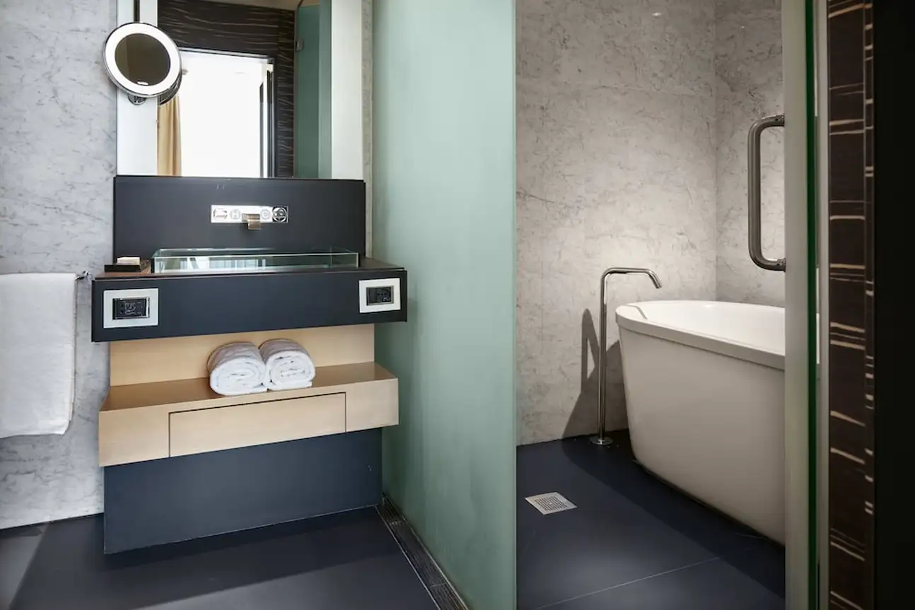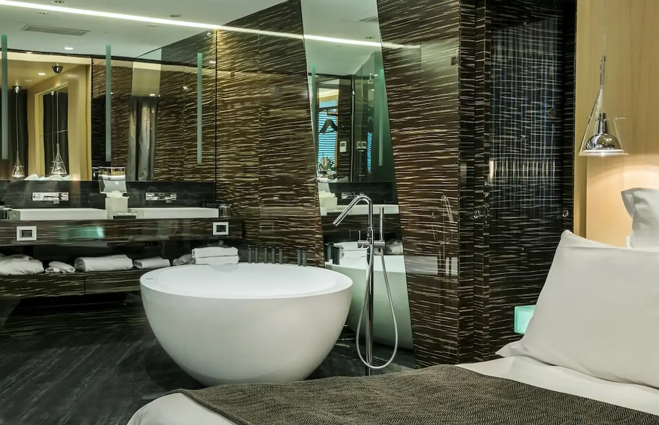 Plus votre numéro d'étage est élevé, meilleure est la vue sur la mer, la colline du Vomero ou encore la chartreuse de San Martino. Côté déco : parquet foncé, bois, marbre, verre dépoli pour séparer la salle de bain d'un salon, douceur des éclairages, harmonie des tonalités et baies vitrées. Dans certaines salles de bains (géantes !), la baignoire offre une option hydromassage et la fenêtre s'ouvre sur Capri et le Vésuve. Idéal pour se détendre après une journée de marche dans les rues de Naples ou dans la chaleur de Pompéi.