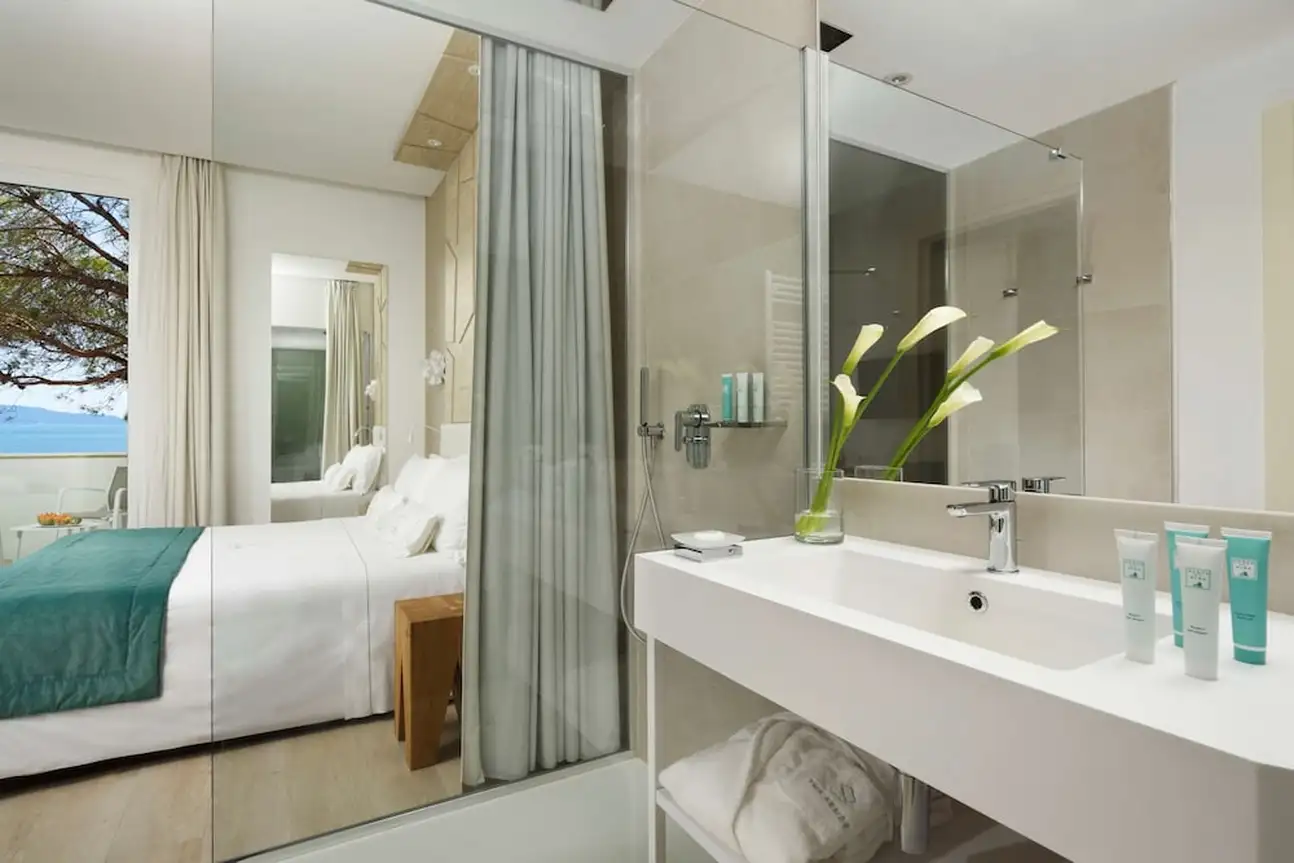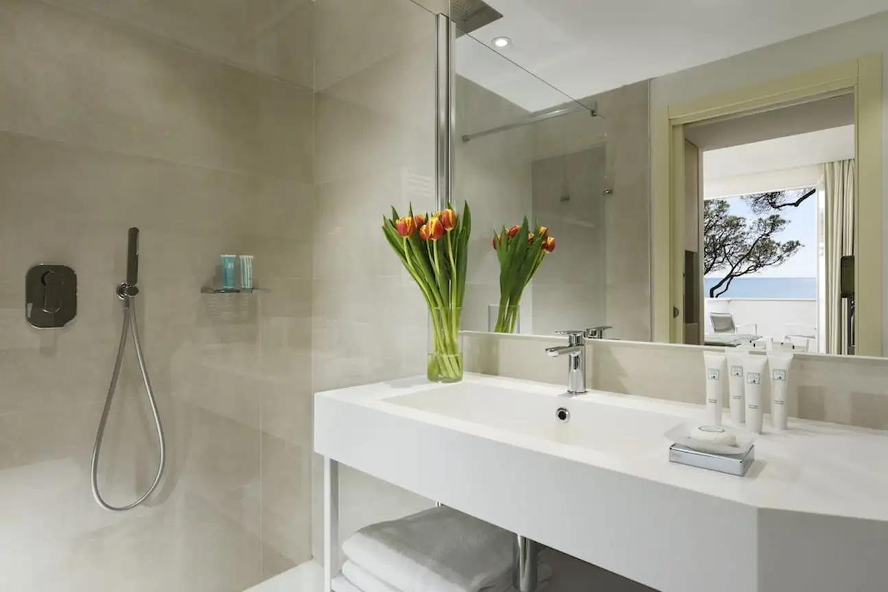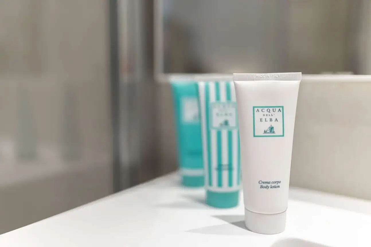 Le voyage se prolonge dans les chambres et suites aux doux parfums de la Maremme. Les parquets et revêtement muraux en bois clair font entrer la pinède dans vos chambres. Des touches de bleu dans toute ses déclinaisons — bleu foncé, bleu ciel, turquoise — invitent la mer à l'intérieur. Et le confort est au max' grâce aux tissus 100 % made in Italy. Les suites Junior pour 4 personnes disposent d’une terrasse avec jacuzzi. Petit bémol seulement pour la déco "standardisée".