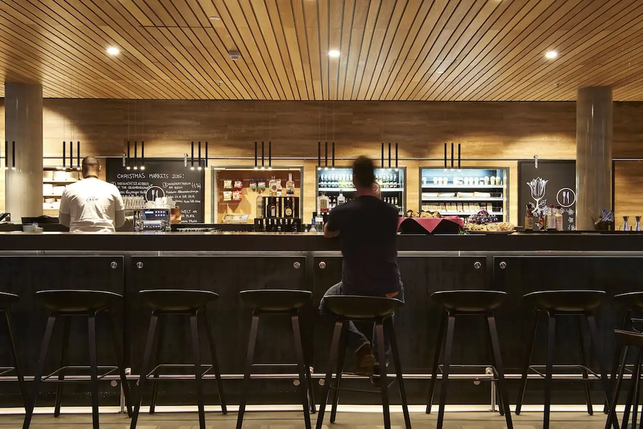 Le petit déjeuner est en libre-service avec pains, céréales, viennoiseries et jus de fruits frais. Le bar propose plats chauds, sandwiches et salades toute la journée et 7 jours sur 7.